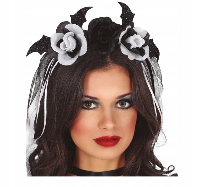 Повязка на голову украшена черными и белыми розами.