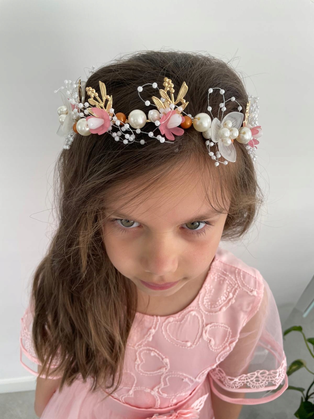 ➤ Венок для причастия, украшенный цветами, жемчугом и нежные золотые листья. Задняя часть венка украшена бантиком.