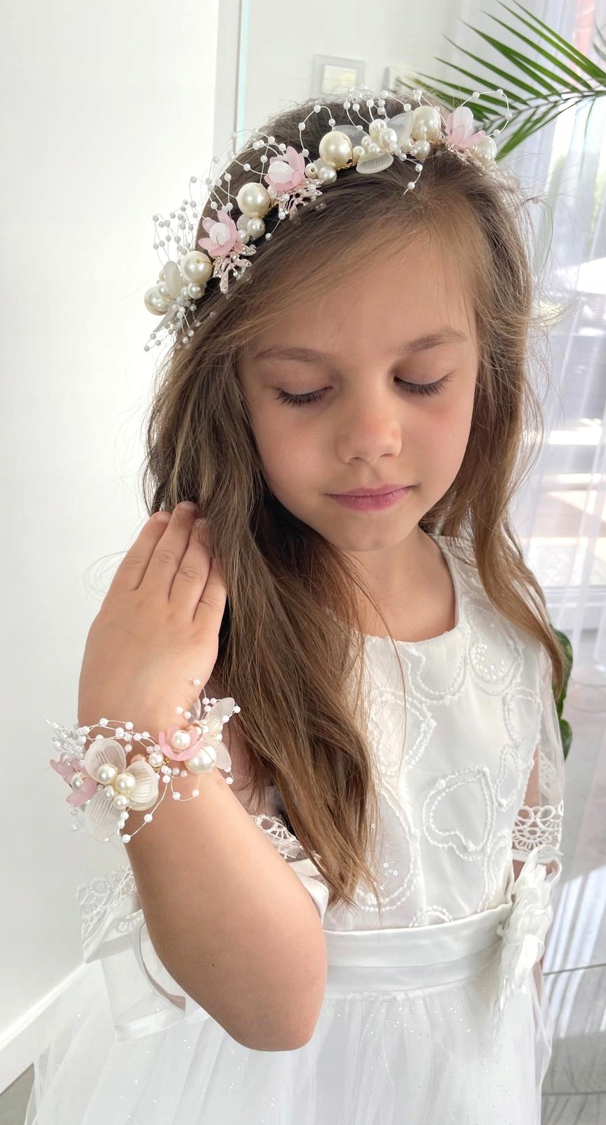Пов'язка вінок для причастя, віночки для причастя на голову рожеві + браслет