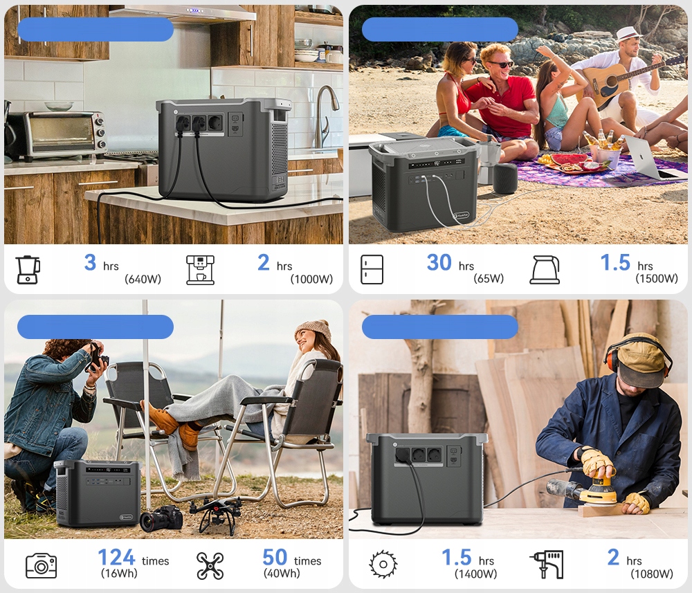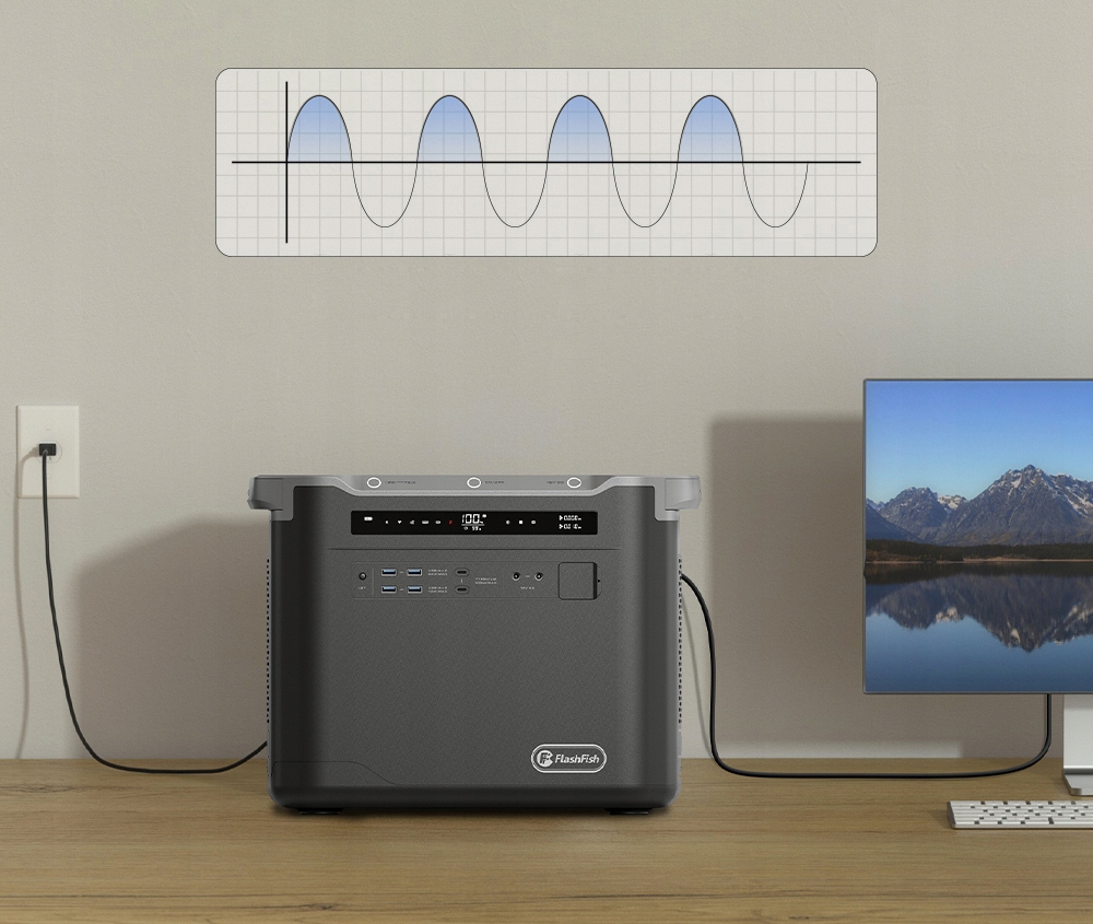 Flashfish 1997 WH Сводка питания оснащен литийной батареей, может эффективно заряжаться солнечной панелью (продается отдельно), источник питания сети (включен) и автомобильное зарядное устройство (включено).