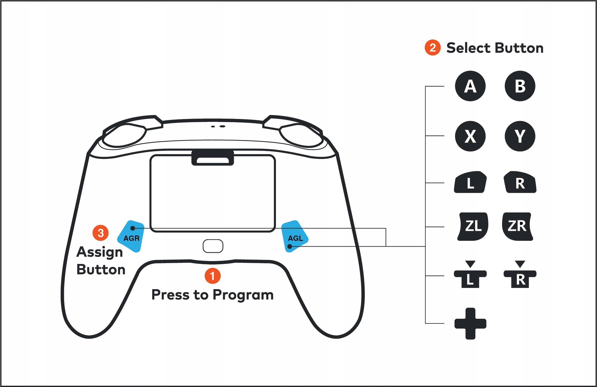 Получите преимущество в любимой игре, назначив дополнительные функции двум кнопкам на задней панели контроллера. Никакого взаимодействия с приложением или панелью управления не требуется. Просто удерживайте кнопку программы в течение 2 секунд (1), затем кнопку, которую хотите сопоставить (2), затем выберите AGR или AGL (3), чтобы завершить процесс быстрого сопоставления кнопок на лету.