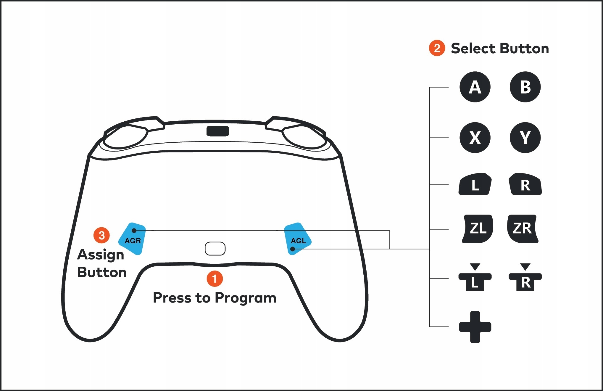Получите преимущество в любимой игре, назначив дополнительные функции двум кнопкам на задней панели контроллера. Никакого взаимодействия с приложением или панелью управления не требуется. Просто удерживайте кнопку программы в течение 2 секунд (1), затем кнопку, которую хотите сопоставить (2), затем выберите AGR или AGL (3), чтобы завершить процесс быстрого сопоставления кнопок на лету.