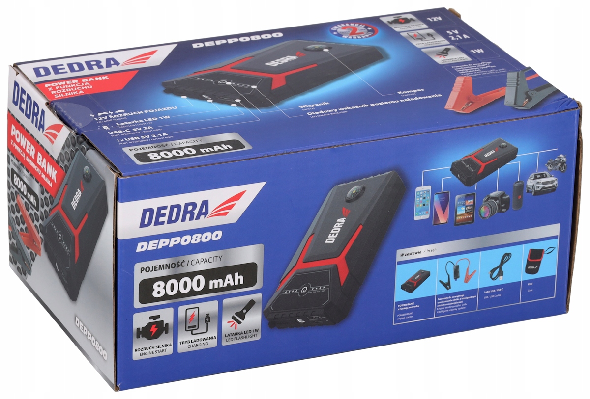 Power-Bank с функцией начала двигателя Dedra Dedra Dedp0800 с емкостью 8000 мАч-это портативное устройство для энергетического банка, которое позволяет быстро заряжать различные электронные устройства, такие как ноутбуки, планшеты, мобильные телефоны, динамики, GPS и другие.