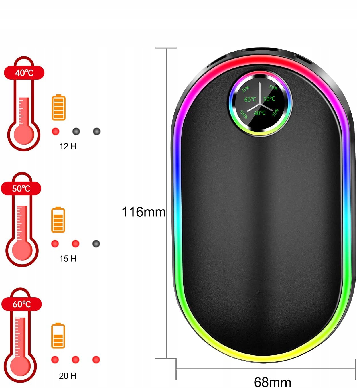- - Оснащен аккумулятором емкостью 10 000 мАч с максимальной энергией и минимальным увеличением веса, он может обеспечивать тепло до 18 часов. Помимо грелки для рук, его также можно использовать в качестве резервного аккумулятора (10000 мАч) для вашего телефона.