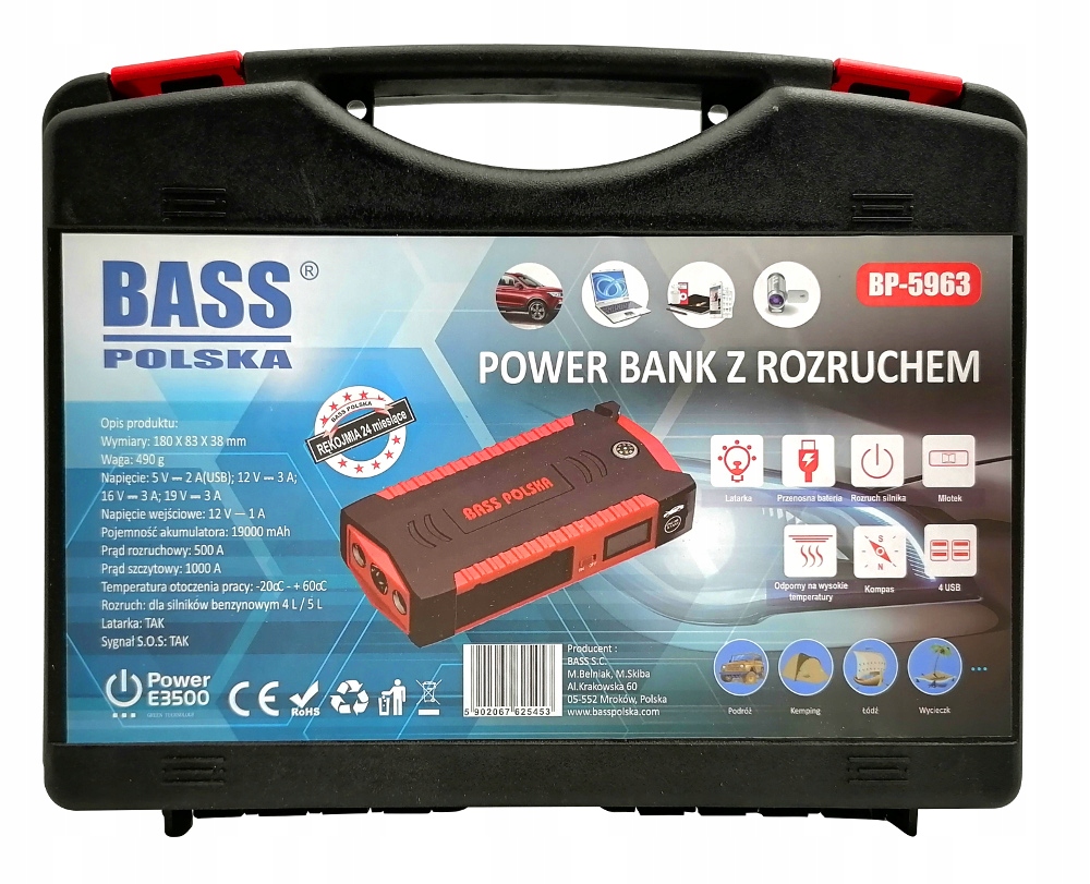 POWERBANK ПУСКОВОЙ ВЫПРЯМИТЕЛЬ СТАРТЕР-БУСТЕР 19000мАч 500-1000А BASS POLSKA