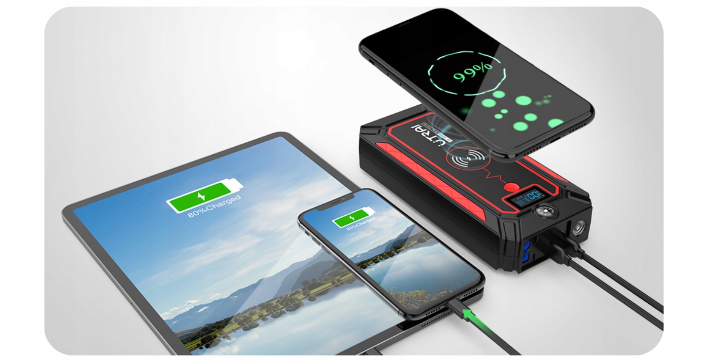 - Беспроводная зарядка: UTRAI также предлагает возможность беспроводной зарядки мощностью 10 Вт, что позволяет заряжать устройства, оснащенные функцией беспроводной зарядки, например смартфоны. или наушники.