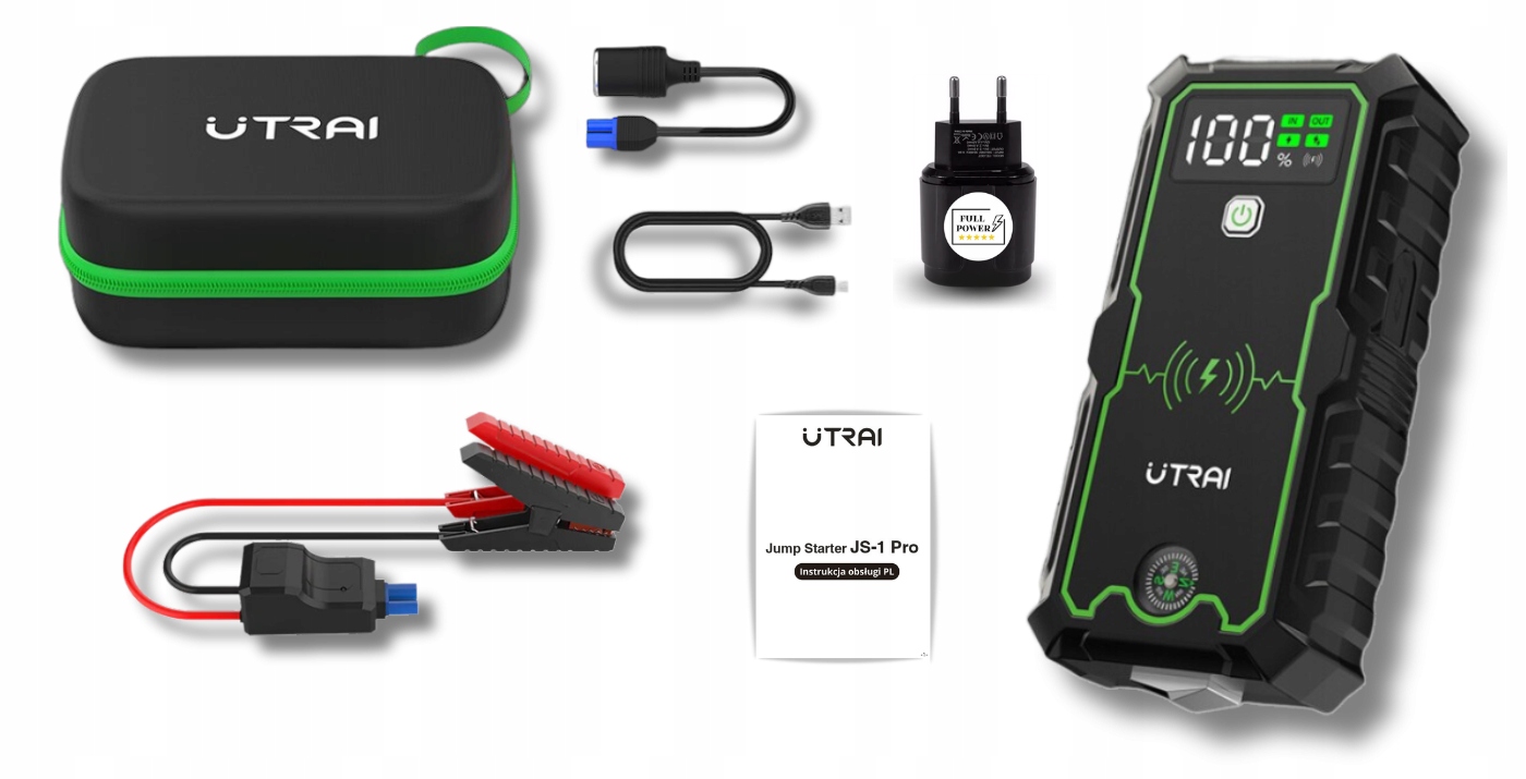 - Комплектация: В комплект входит все необходимое – кабели, кабель USB-C, инструкция на польском языке, сигарета. адаптер для прикуривателя и зарядное устройство Full Power®.