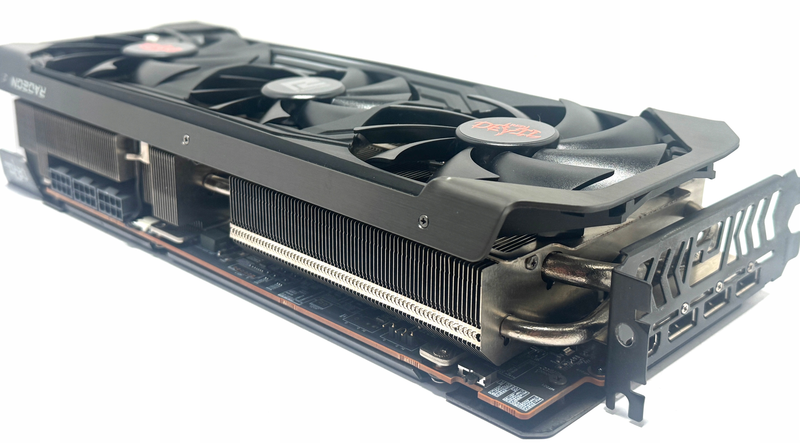 Powercolor Radeon RX 6900 XT Благодаря высокому давлению воздуха тепло, накопленное в массивном радиаторе, более эффективно разбросано. Алюминиевые ребра сочетают в себе три 8 мм и четыре нагрева 6 мм, которые эффективно получают тепловую энергию от графического процессора. Металлическая задняя пластина дополнительно усиливает всю структуру и улучшает свойства пассивного рассеяния тепла.