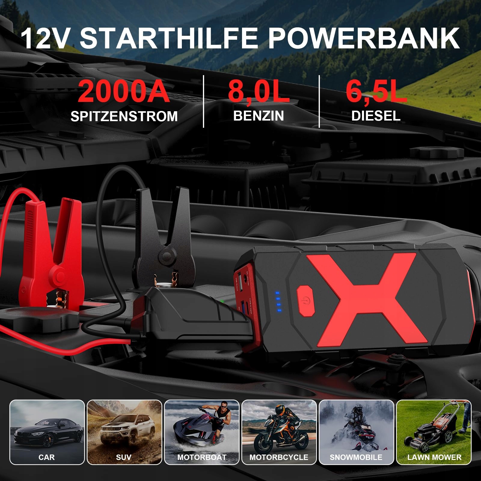 - 【2000A Jump Starter Powerbank】: автомобильный аккумулятор емкостью 20000 мАч позволяет безопасно запустить разряженную батарею за считанные секунды. Этот компактный автомобильный стартер представляет собой мощное устройство, обеспечивающее пиковый ток 2000 А, подходящее для бензиновых двигателей объемом до 8,0 л и дизельных двигателей объемом до 6,5 л. При полной зарядке его можно использовать максимум 40 раз. Может работать при температуре от -20°C до 65°C для грузовиков, легковых автомобилей, садовых тракторов, газонокосилок, мотоциклов, внедорожников, фургонов, внедорожников, гидроциклов, яхт и т. д.