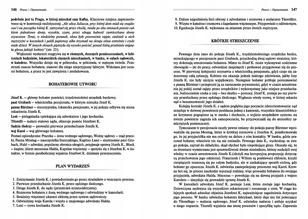 Процесс описывает судьбу Юзефа К., банковского служащего, которого однажды арестовали в его квартире, хотя он не совершил никакого преступления. Он может оставаться на свободе, но должен всегда находиться в распоряжении суда. Известие об аресте дошло до друзей Юзефа, и они сразу изменили свое отношение к нему. Более того, в его жизни стали происходить непонятные, абсурдные события. Во время многочисленных допросов мужчина протестует против окружающих его судебных органов, но сделать ничего не может. Весь процесс абсурден: вина и наказание не указаны, нет обвинительного заключения, защита неэффективна. Наконец Юзеф решает сдаться затянувшей его машине...