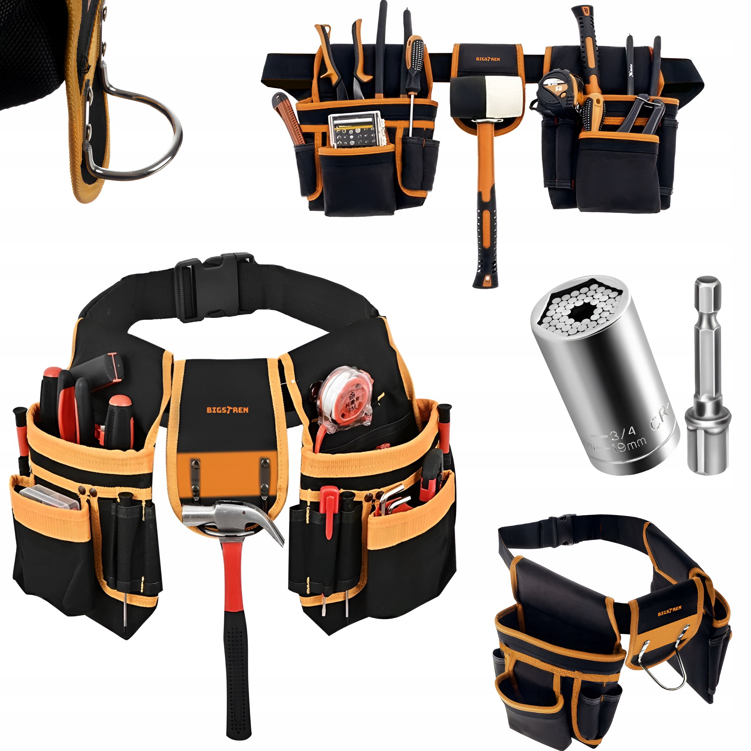 - ОРГАНИЗАЦИЯ + ВЫДВИЖНЫЕ СУМКИ - пояс для инструментов имеет различные карманы и петли, которые позволяют организованно упорядочивать и хранить различные инструменты. Это помогает избежать беспорядка и хаоса на рабочем месте. Дополнительным преимуществом этого ремня являются 2 выдвижные корзины.