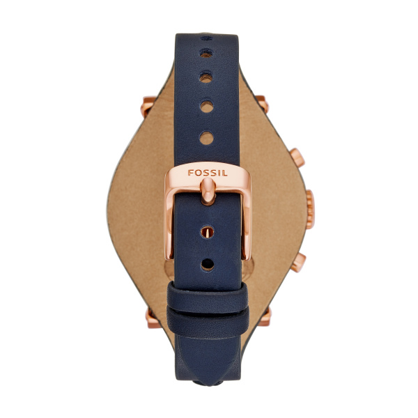 Оригинальный ремешок для часов Fossil Boyfriend для модели ES3838 из натуральной кожи темно-синего цвета, гладкий, матовый, с шайбой, застежка из нержавеющей стали розового золота. На поясе декоративные заклепки из розового золота.