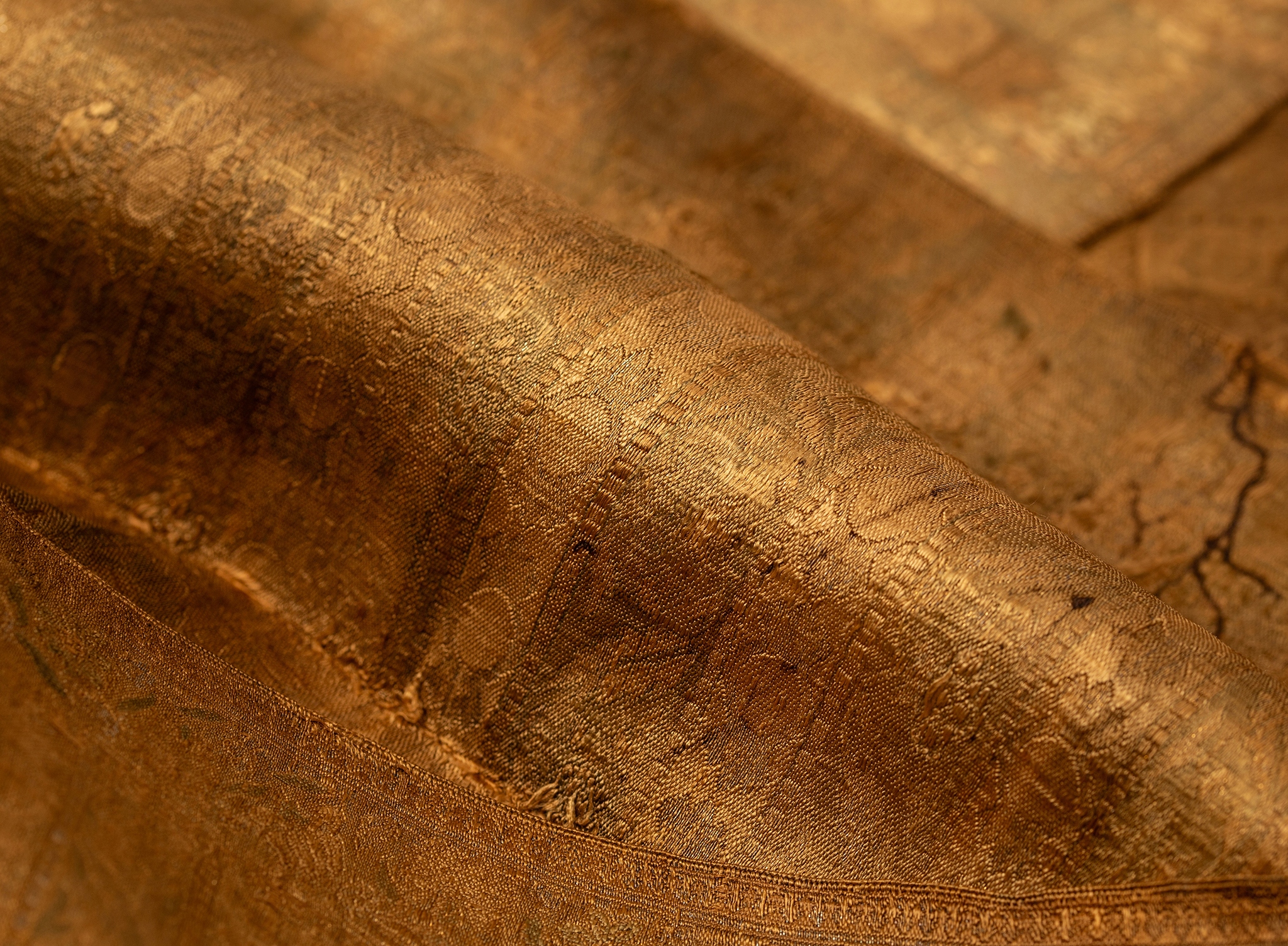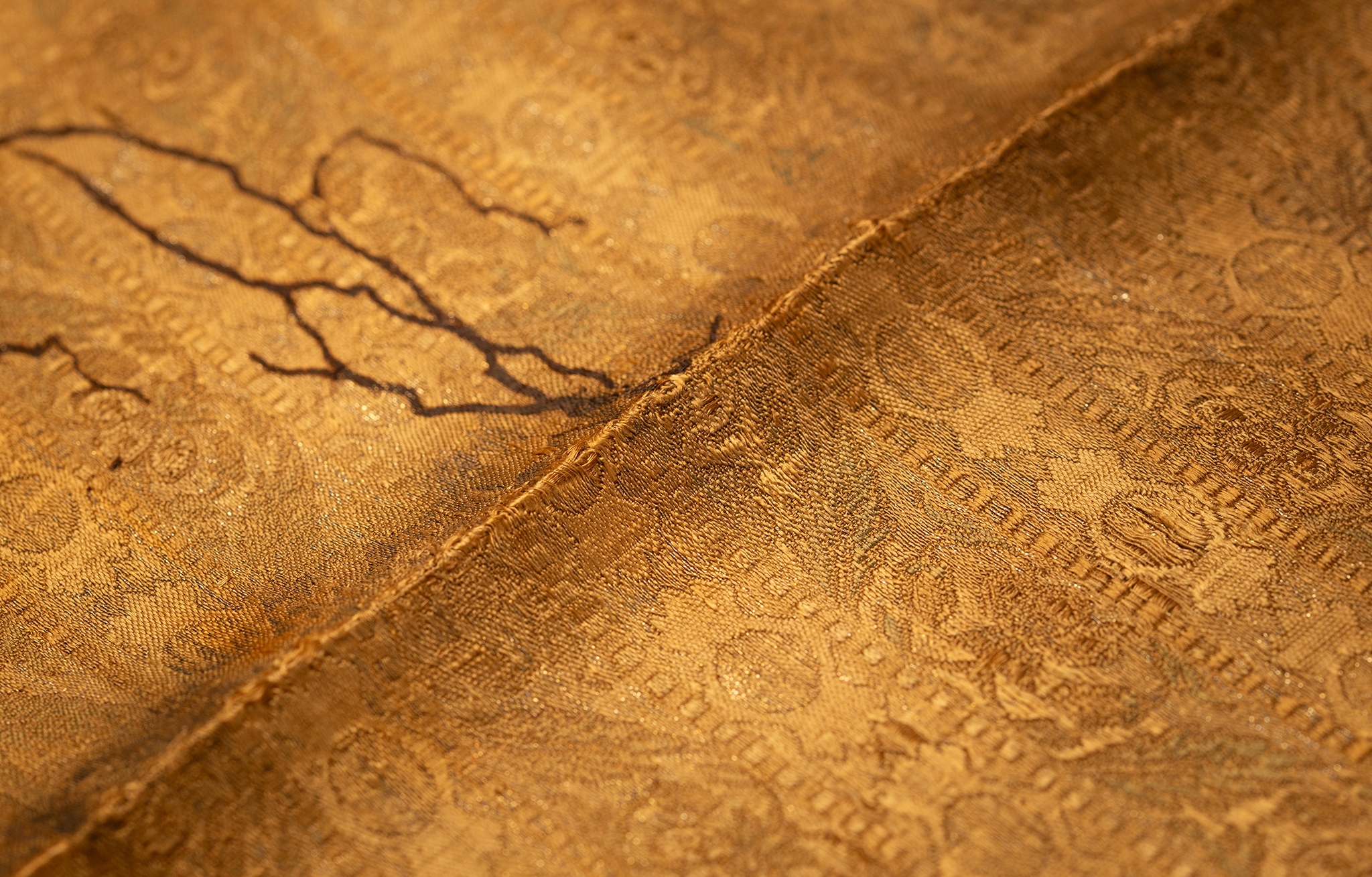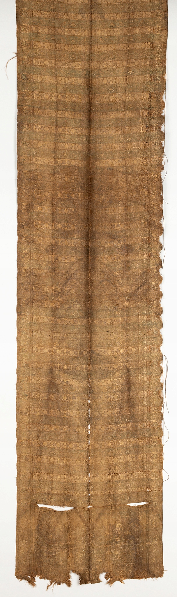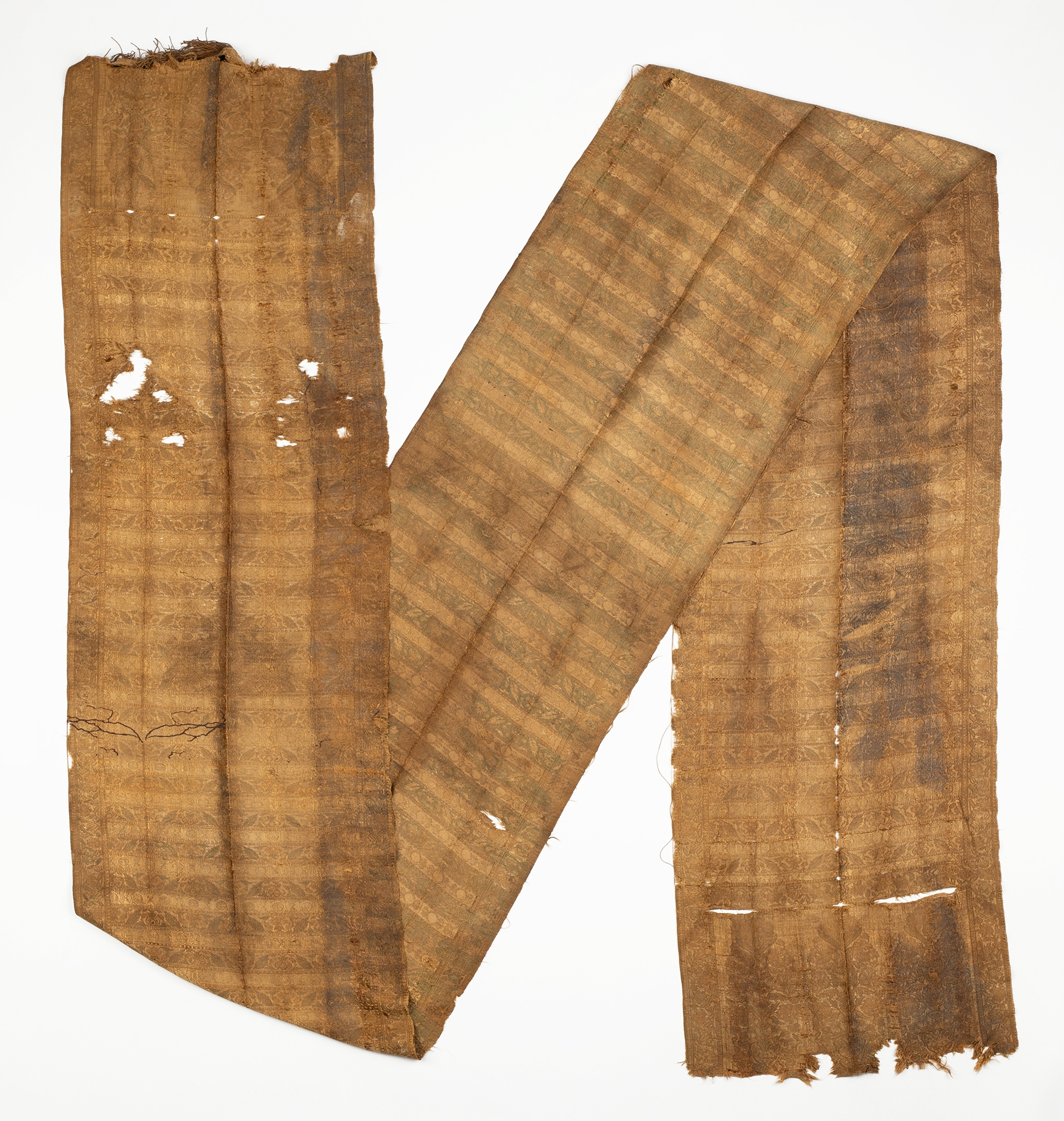 Уникальный предмет, являющийся символом польской дворянской традиции, - цельный халатовый пояс из шелковой пряжи, переплетенной золотой нитью. Предлагаемый предмет можно идентифицировать как изделие, происходящее из мастерской армян-христиан из Стамбула, на что указывают его характерные особенности. Ремень изготовлен из шелковой пряжи и золотого никеля. Завершающие поля украшены тремя мотивами цветочного куста овальной формы с центральным стеблем и боковыми ветвями, расположенными под углом 45 градусов. Куст увенчан цветком пальметты. Полки украшены чередующимся геометрическим мотивом и веночным орнаментом с мотивом гвоздик и мелкозубчатыми листьями.