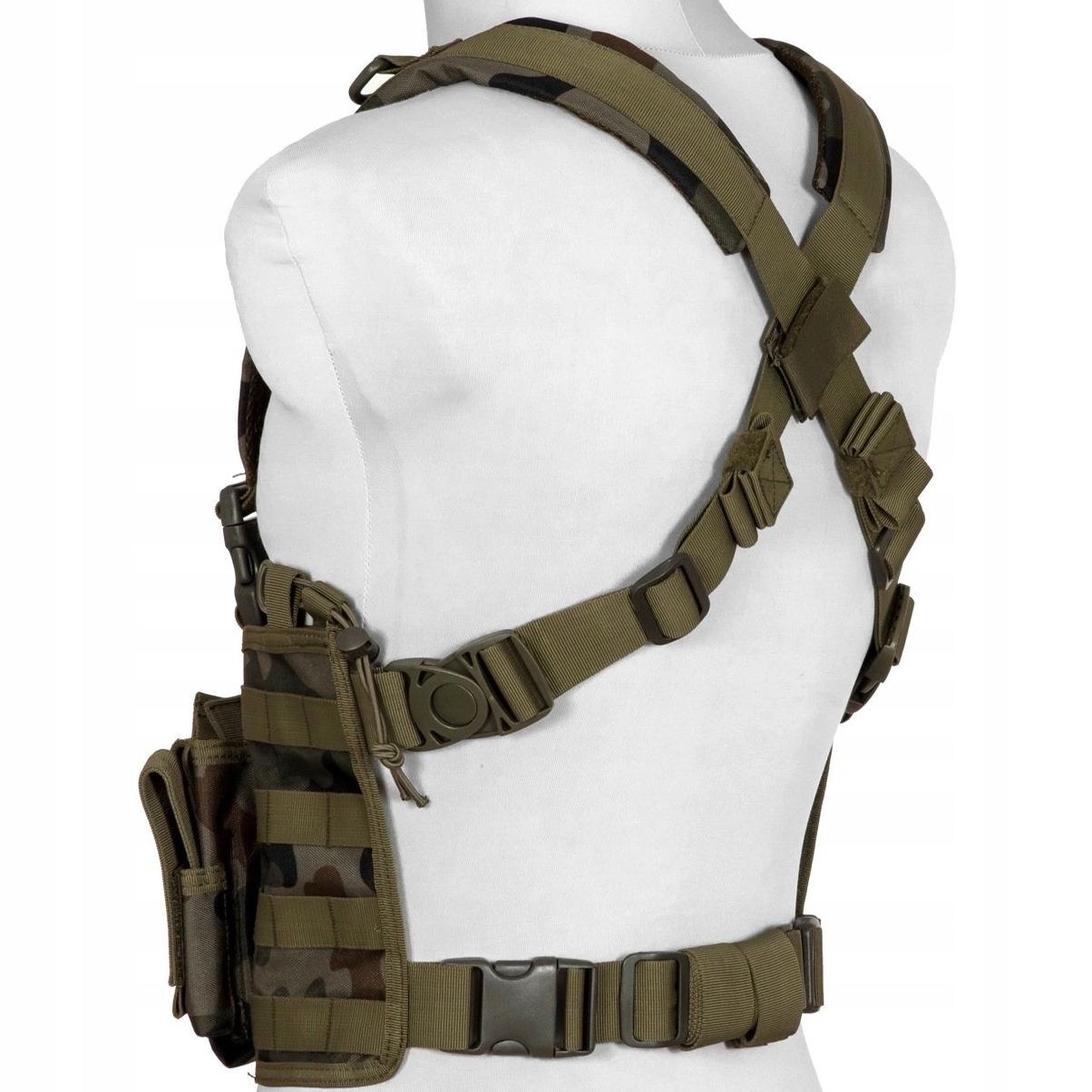 Тактический жилет BRAVO wz.93 популярного рисунка Chest Rig, изготовленный из прочного и легкого нейлона. Изделие имеет три двойных подсумка, вмещающих в общей сложности 6 магазинов стандарта М4 или АК. Дополнительно в каждый подсумок входят 2 подсумка меньшего размера, оснащенных отрывными клапанами для пистолетных магазинов. Такое расположение подсумков позволяет оптимально разместить дополнительное оборудование, такое как рация, фонарик, телескопическая дубинка и т. д.
