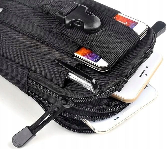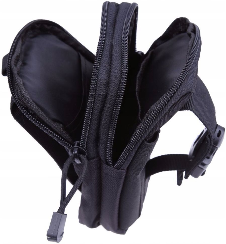Сумка в стиле милитари, крепящаяся на бедре ремнем, черная. В сумке поместится множество разных предметов, таких как смартфон, документы, телефон, ключи от машины, перочинный нож, ключи от дома, фонарик, блокнот и другие. Размеры 60х100х160 мм.