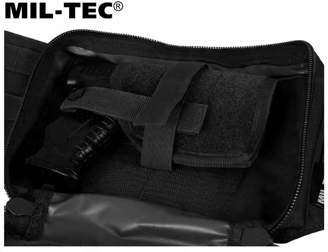 Благодаря своей конструкции сумка облегчает вытаскивание оружия в положении сидя, а также позволяет эффективно спрятать оружие и боеприпасы под одеждой.