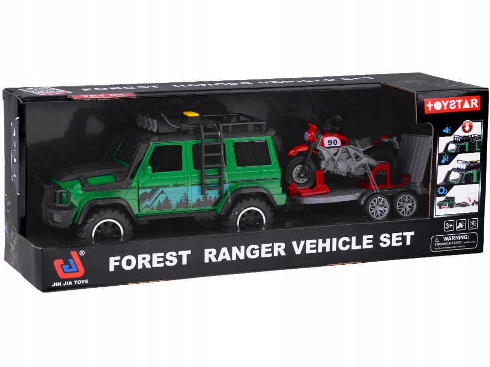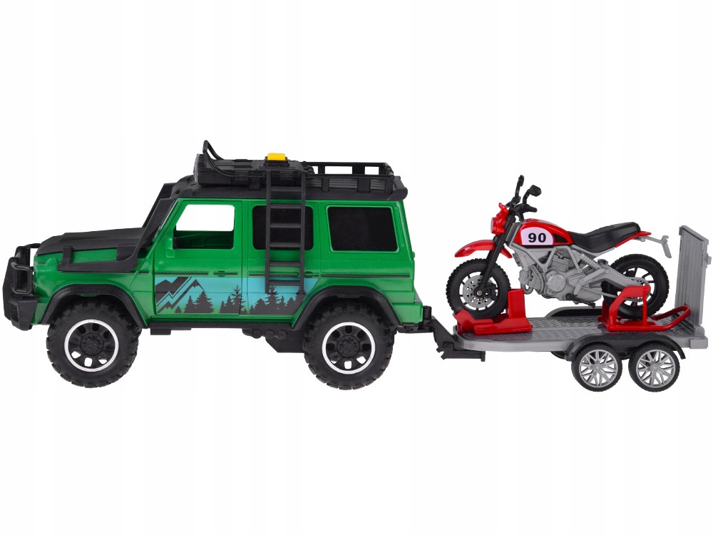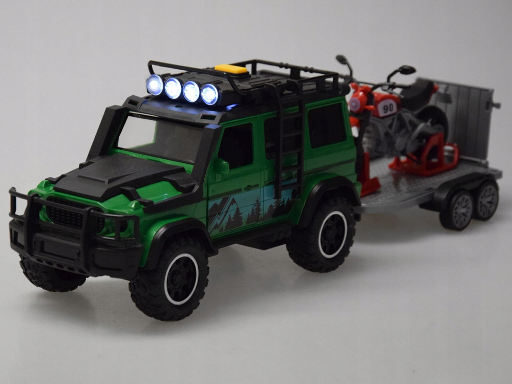 - Набор «Внедорожник с прицепом» – идеальное предложение для маленьких любителей автомобилей и перевозки любимых игрушек. В набор входит интерактивный внедорожник зеленого цвета с черными вставками, оснащенный открывающимися передними дверями, съемной лестницей, звуковыми и световыми эффектами и вращающимися резиновыми колесами. Дополнительно у автомобиля сзади имеется крюк для крепления прицепа. Серебристый прицеп, напоминающий эвакуатор, имеет сдвижной задний люк, резиновые, поворотные колеса и идеально подходит для перевозки мотоцикла, который также входит в комплект. Эти автомобили, работающие от аккумуляторов AG13, подарит часы творческого веселья. Общие размеры набора составляют примерно 40 см х 13 см х 11 см, внедорожник — 12,5 см х 13 см х 11 см, прицеп — 15 см х 3,5 см х 10 см, мотоцикл — 12 см х 6 см х 9 см. Набор «Внедорожник с прицепом» - прекрасный подарок для детей, которые любят активно проводить время, создавая свои собственные приключения. Откройте для себя широкий выбор детских игрушек в магазине Джокомисиада и подарите своему ребенку незабываемые минуты, полные радости и веселья!