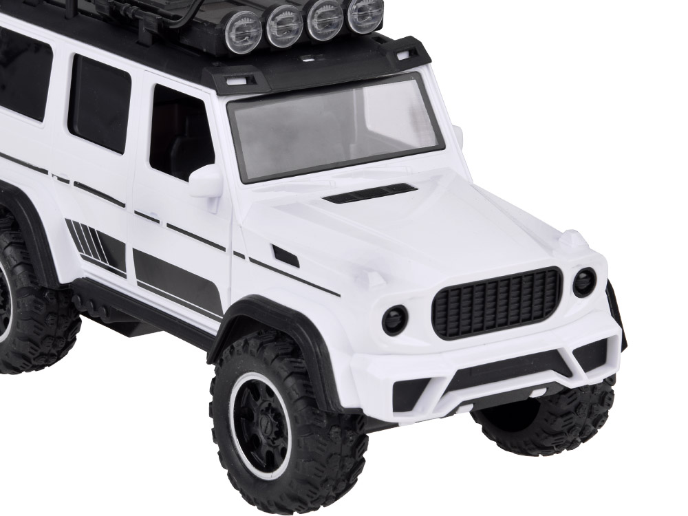 Внедорожник, созданный для развлечения каждого маленького водителя. Автомобиль сделан очень тщательно и качественно. Кузов автомобиля из белого пластика выглядит великолепно. На крыше имеется багажник и большие фонари, освещающие пространство перед автомобилем. У автомобиля открываются передние двери, есть звуковые эффекты и мигающие огни на крыше.