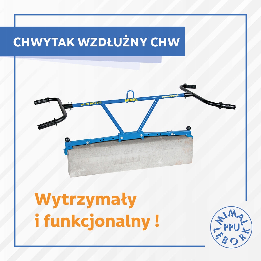 Продольный грейфер для укладки дорожного покрытия MIMAL CHW, оснащенный съемными ручками. Дополнительная транспортная проушина в центральной части захвата позволяет установить его на большинство машин с функцией подъема.ТЕХНИЧЕСКИЕ ПАРАМЕТРЫ