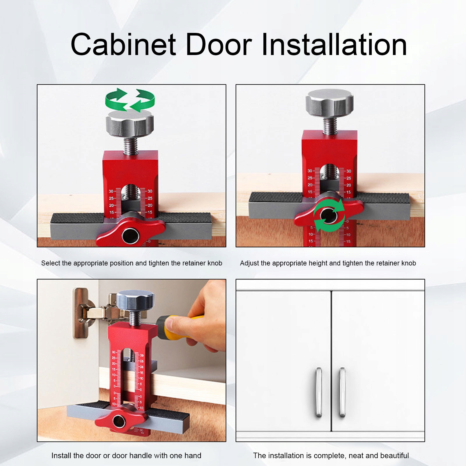 3. ТОЧНОЕ ПОЛОЖЕНИЕ: шаблон для установки дверцы шкафа является профессиональным монтажным инструментом, он имеет точную шкалу для удовлетворения потребностей разной высоты, не наклоняется без отклонений, ручка прочная и не болтается, с точным качеством изготовления, всегда не забывайте устанавливать дверцу шкафа при выравнивании выравнивания