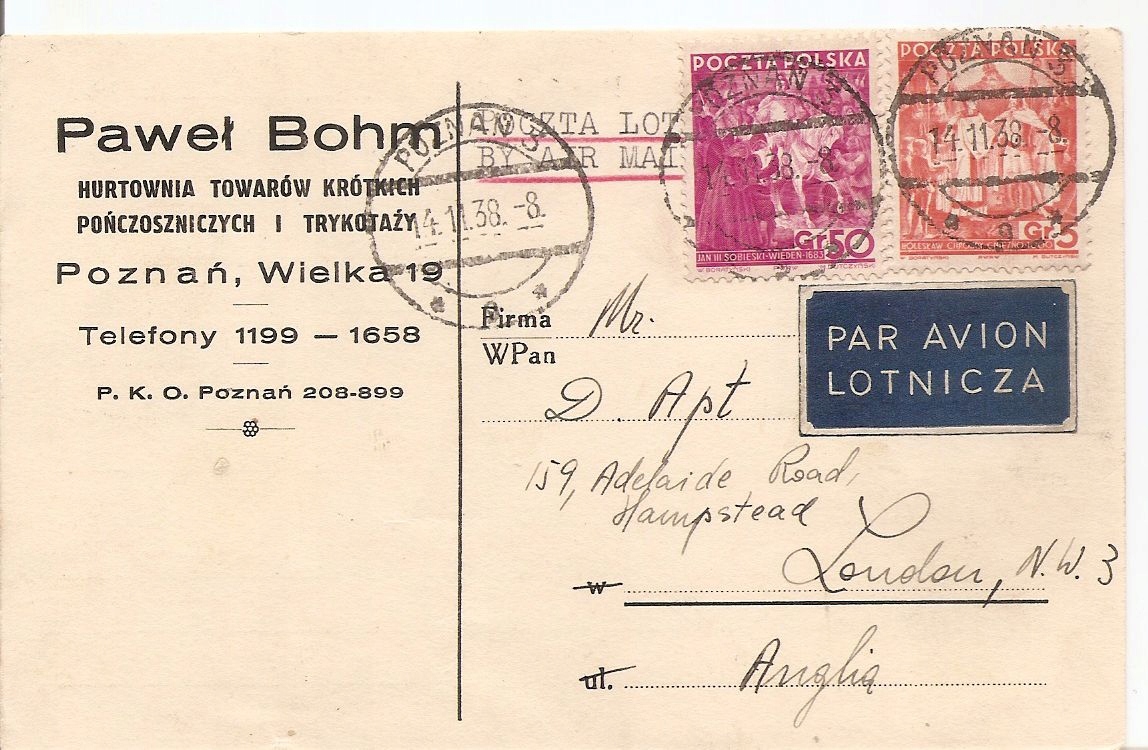 POZNAŃ -PAWEŁ BOHM -POŃCZOCHY -KARTA -1938 rok
