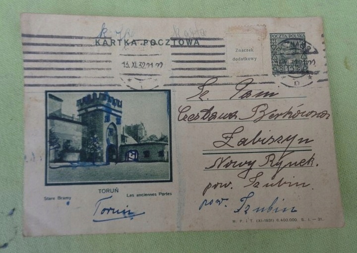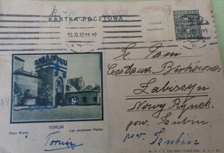 Интересная открытка, отправленная 13 ноября 1932 года из Познани в Лабишин Шубинского уезда. На открытке изображены Старые ворота Торуни. Открытка маркирована с обеих сторон. К экспонату прикреплена марка того времени. Открытка была адресована Старой рыночной площади в Лабишине. Рекомендую коллекционерам и не только.