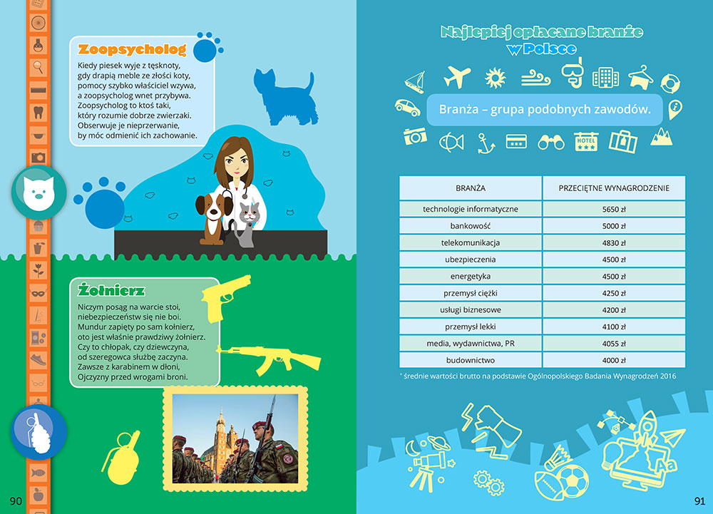 Есть профессии, с которыми дети сталкиваются ежедневно (парикмахер, врач, учитель), профессии, распространенные, но труднообъяснимые ребенку (юрисконсульт, градостроитель, сборщик долгов), а также стихи о необычных профессиях. , интересный, интересный (ныряльщик за жемчугом, зоопсихолог, жокей). Стихи сопровождаются красочными рисунками или фотографиями, и все выполнено в приятных глазу цветах, эстетично и весело, поэтому дети не смогут оторваться от этой книги. Кто знает, может быть, они найдут вдохновение в том, какой профессией захотят заниматься в будущем?
