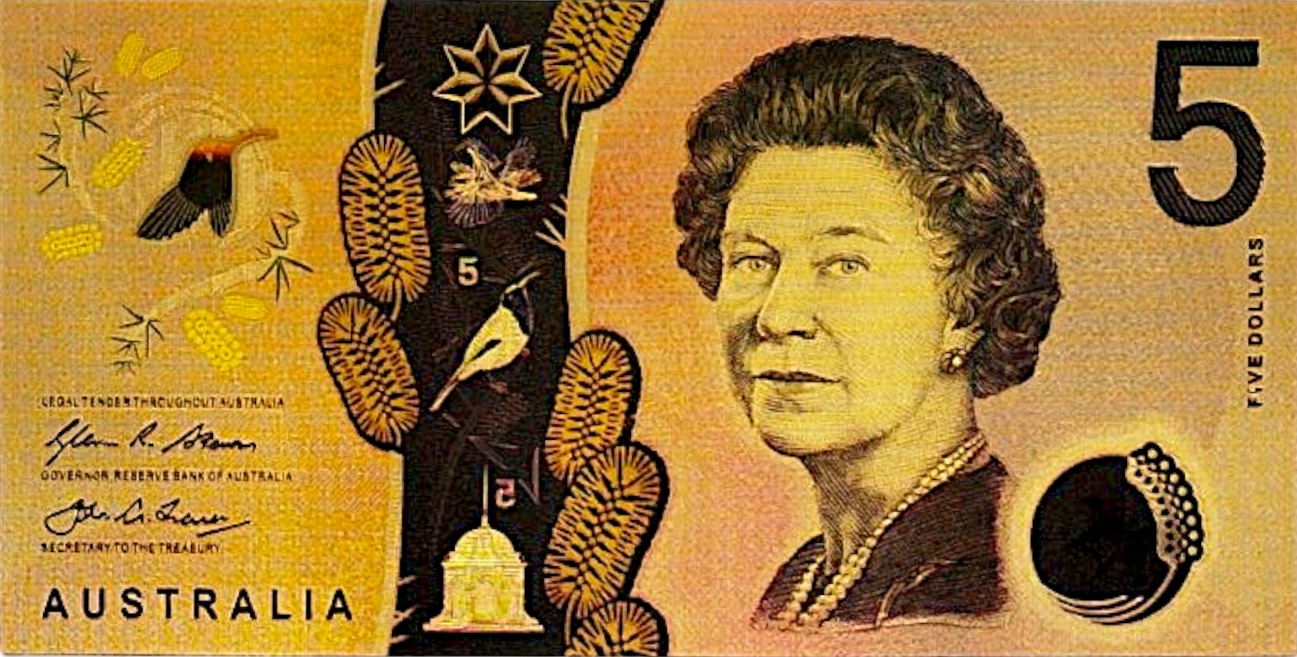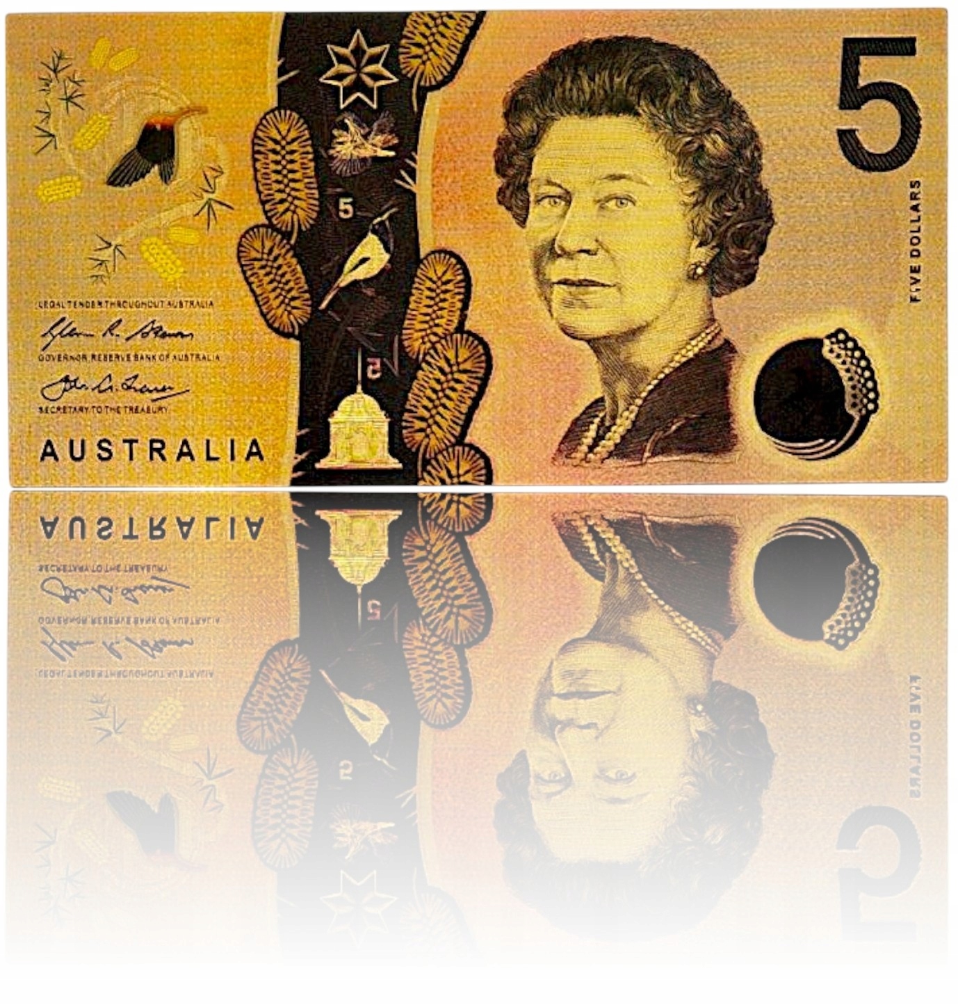 Изображено здание австралийского парламента в Канберре — символ демократии и национального единства. Золотой фон с замысловатыми деталями придает банкноте глубину и неповторимый характер.