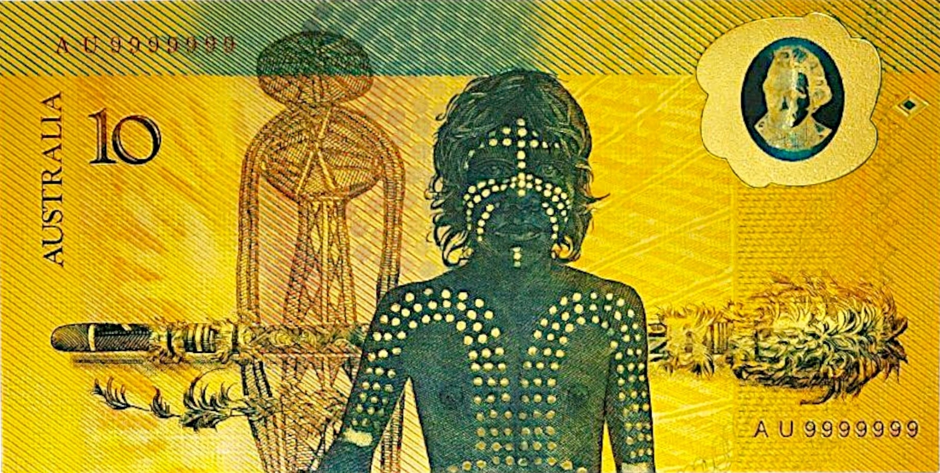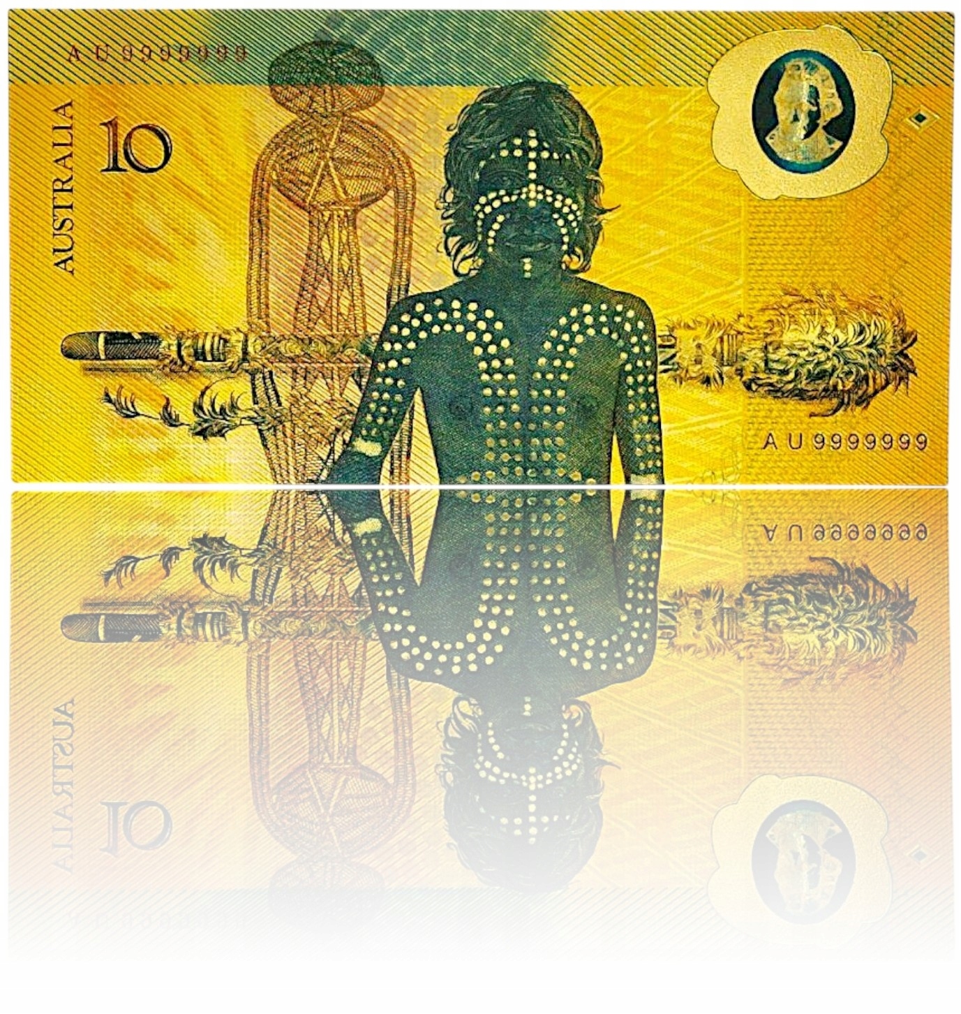 На лицевой стороне банкноты изображена фигура аборигена, украшенная традиционными ритуальными рисунками — символом глубоко укоренившейся культуры и духовности коренных народов Австралии.
