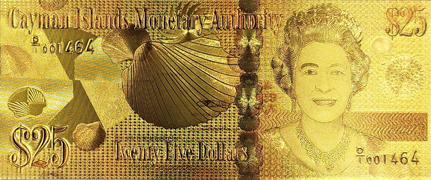 ПОЗОЛОЧЕННАЯ БАНКНОТА 25 ДОЛЛАРОВ КАЙМАНОВЫ ОСТРОВА КОРОЛЕВА ЕЛИЗАВЕТА II