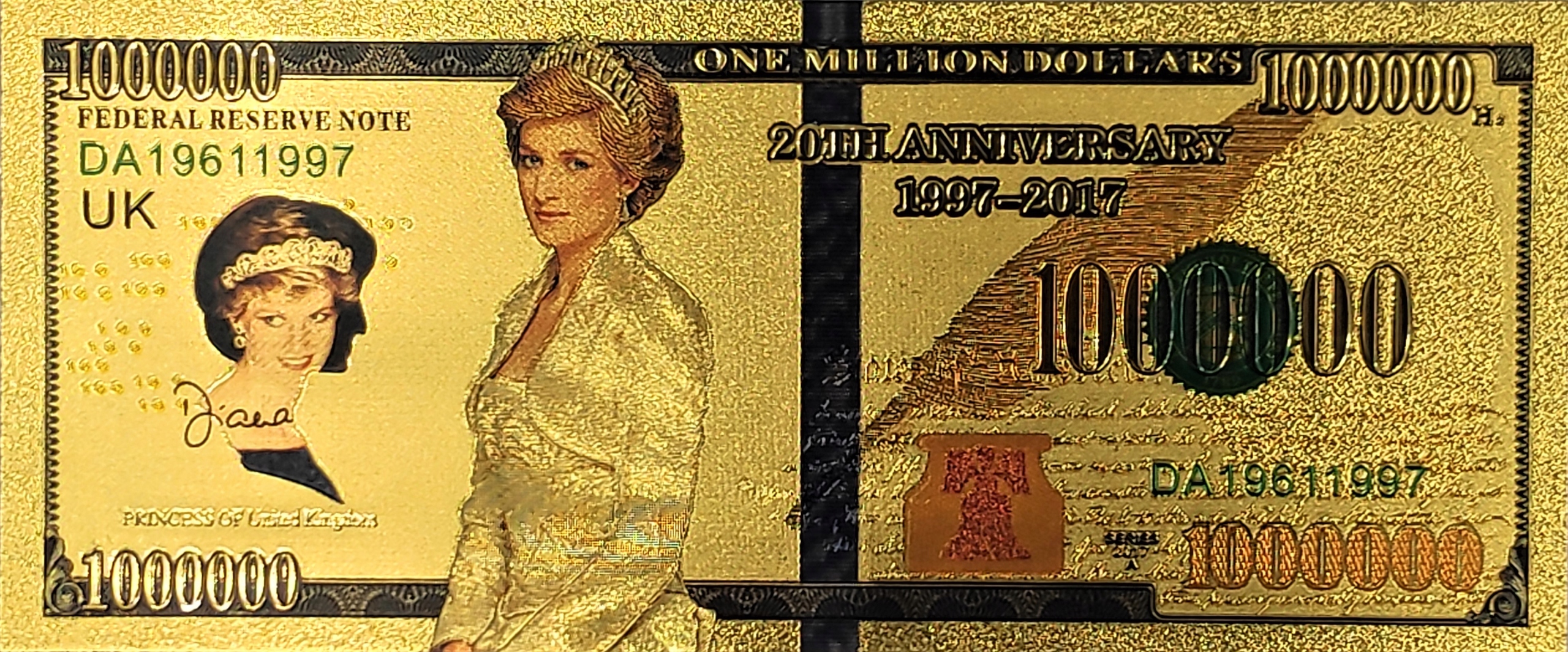 Красивая позолоченная коллекционная банкнота в 1 000 000 долларов с изображением принцессы Дианы Спенсер.
