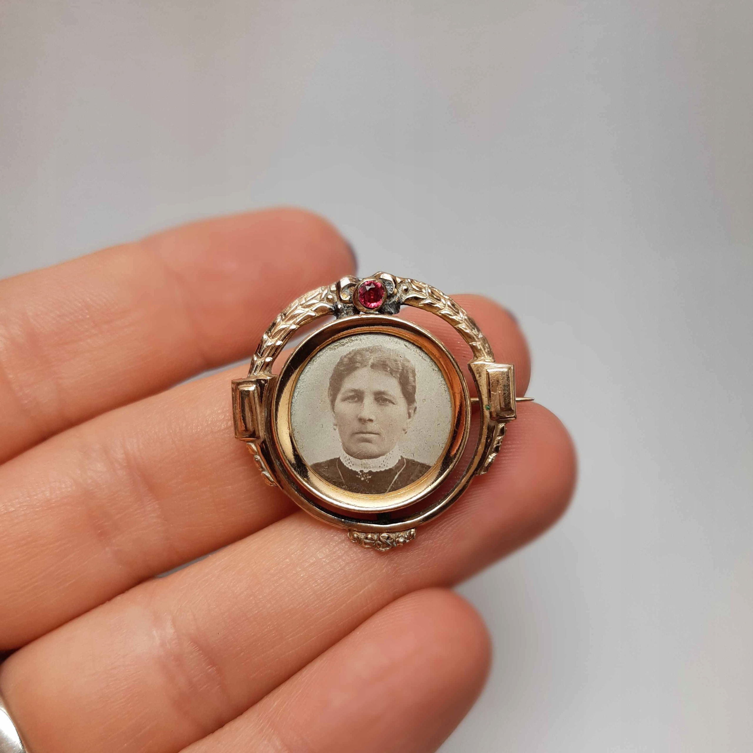 Предмет продажи — брошь XIX века из позолоченной латуни,со старинной фотографией, украшенная камнем рубином