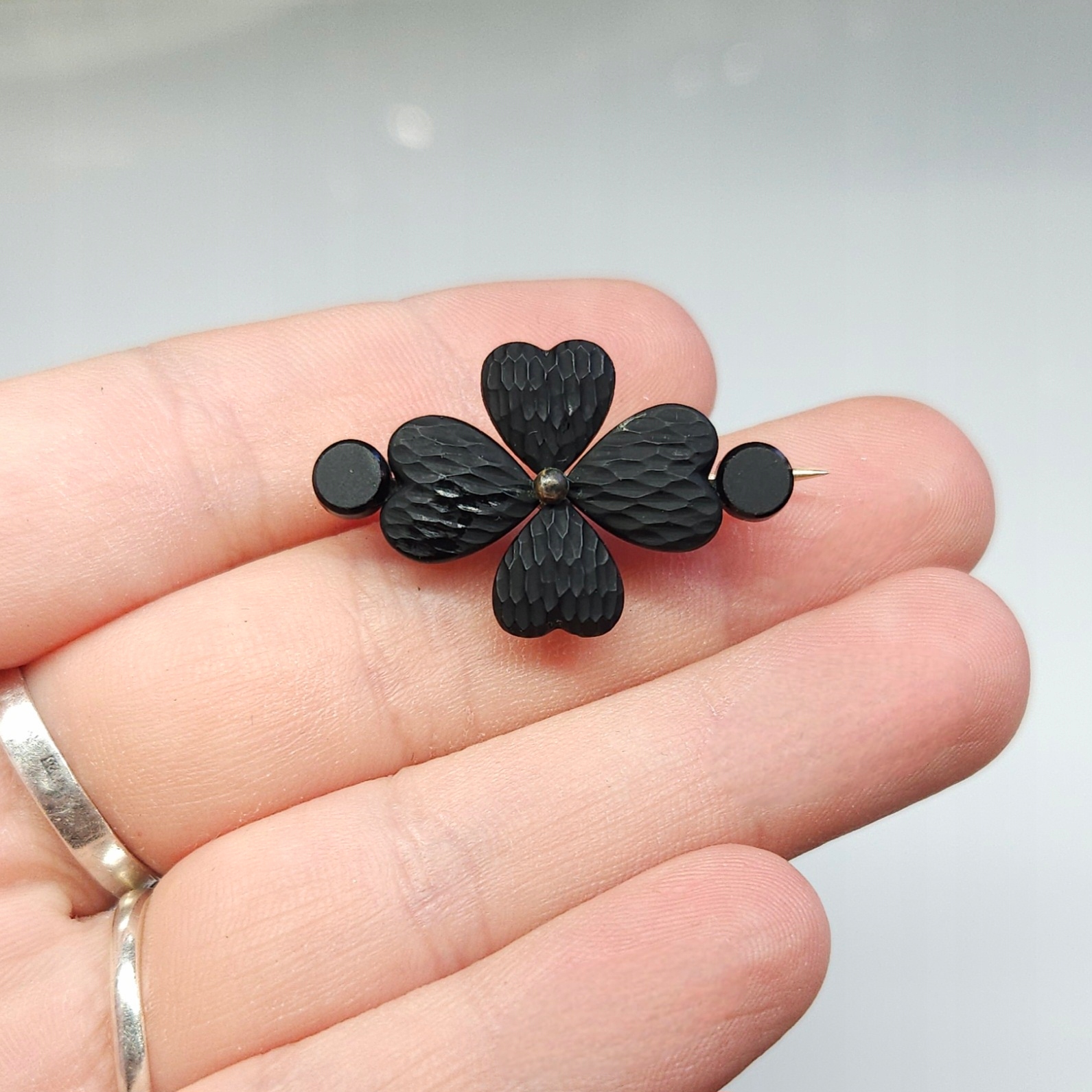 Предмет продажи - позолоченная с торца брошь. 19 век - сентиментальные украшения, украшенные мотивом клевера или сердца, из черного камня - вероятно гагат.