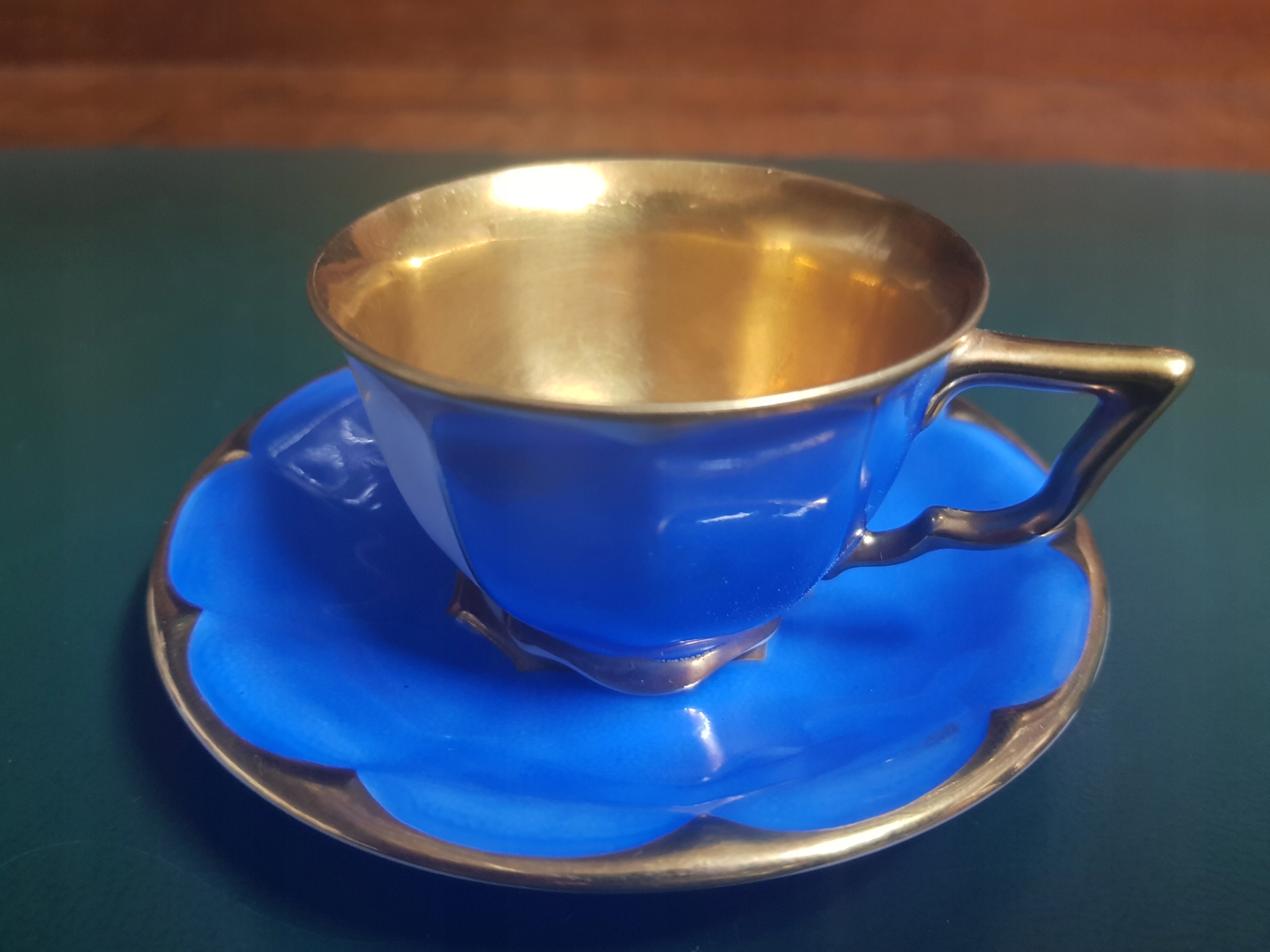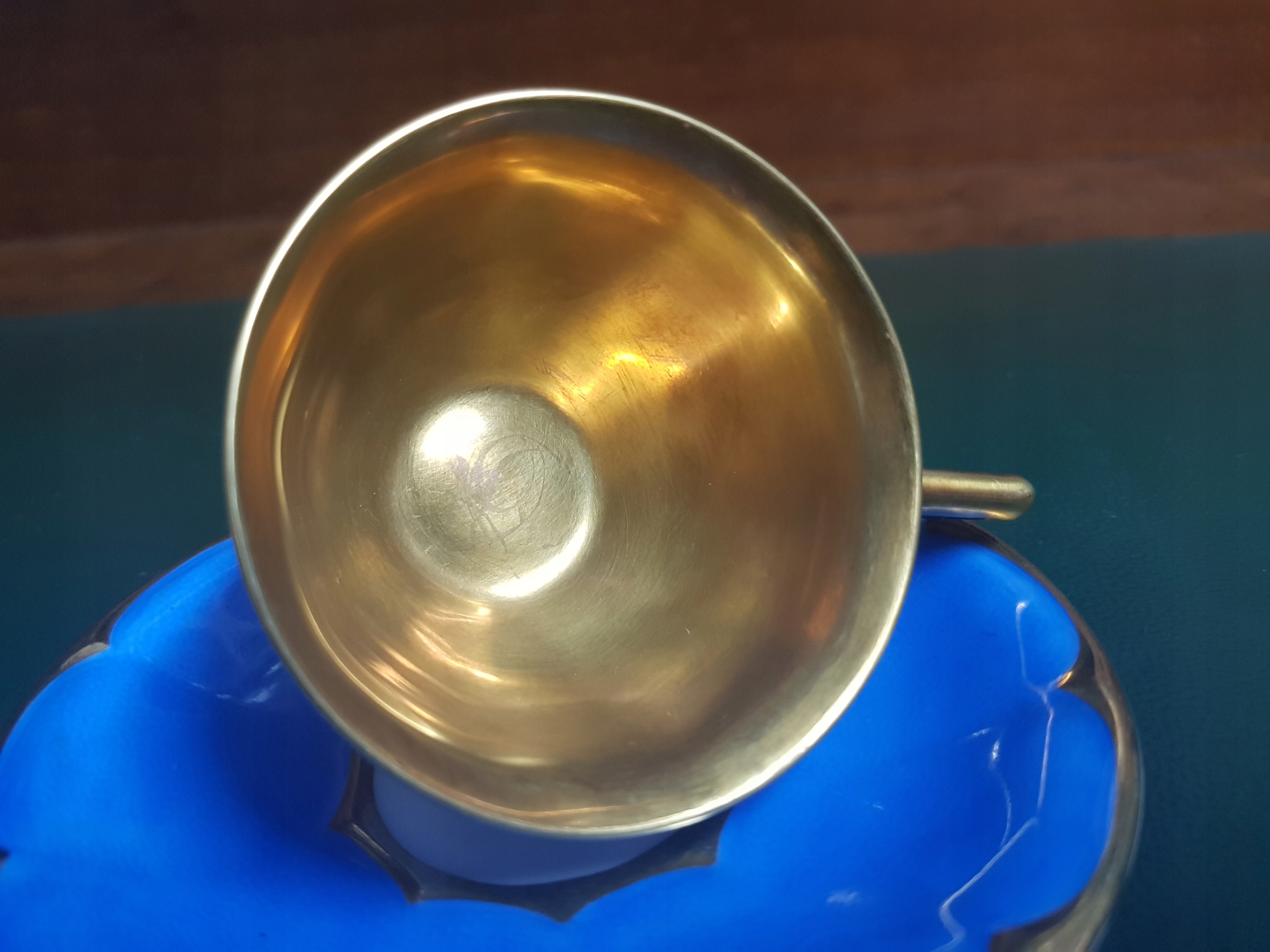 Предмет аукциона — чашка размером с мокко, позолоченная, украшенная нарисованным вручную гербом.