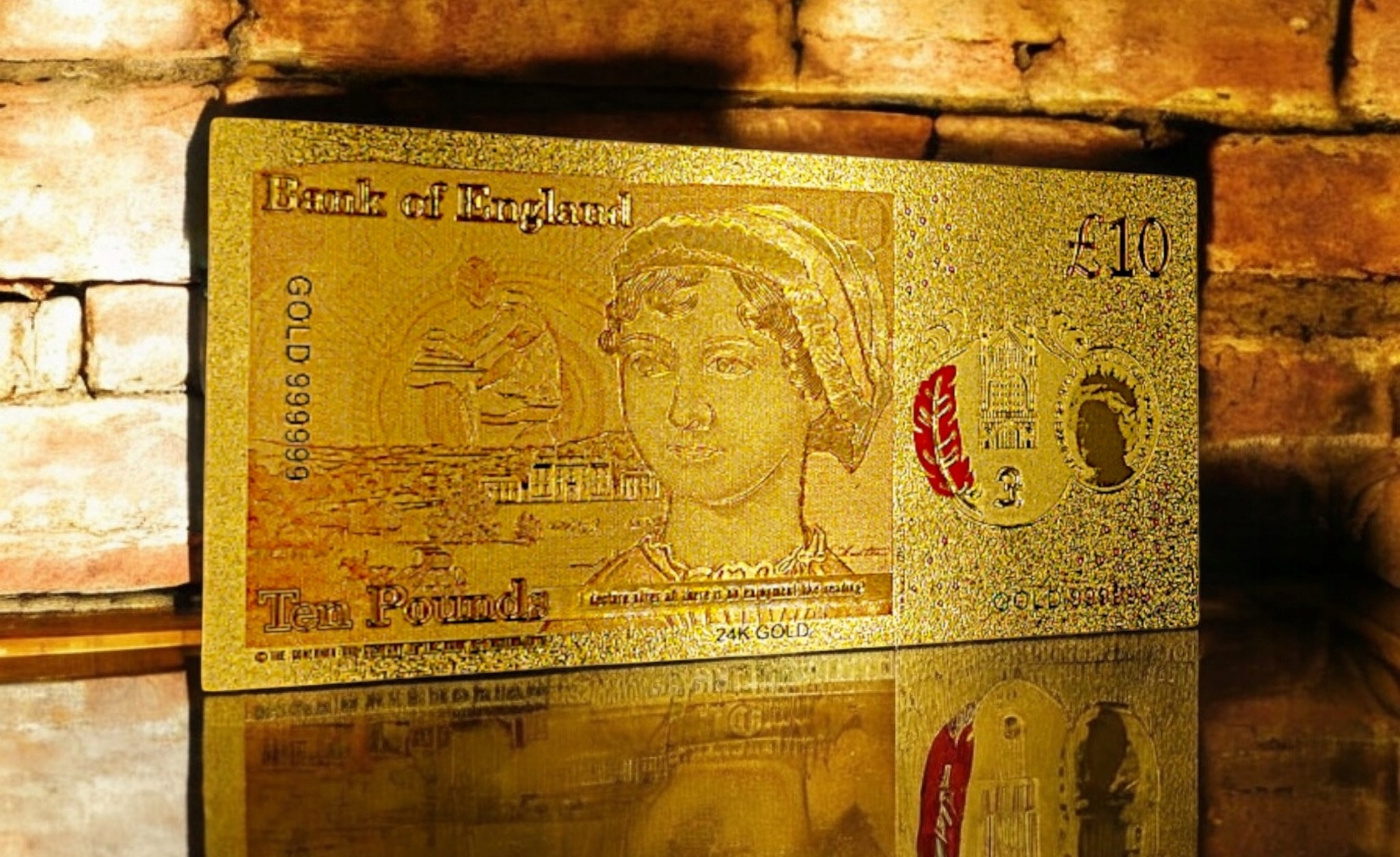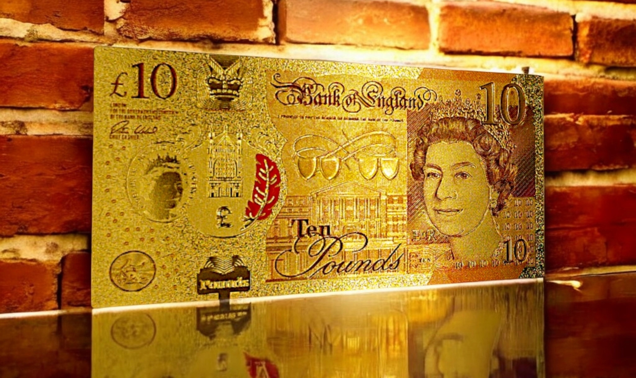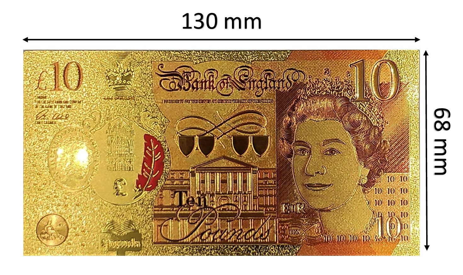 Позолоченная банкнота номиналом 10 фунтов станет прекрасным дополнением к любой коллекции. Эта красиво оформленная банкнота является символом престижа и элегантности. Благодаря точному покрытию золотом банкнота выделяется своей уникальностью и привлекает внимание своим роскошным блеском.