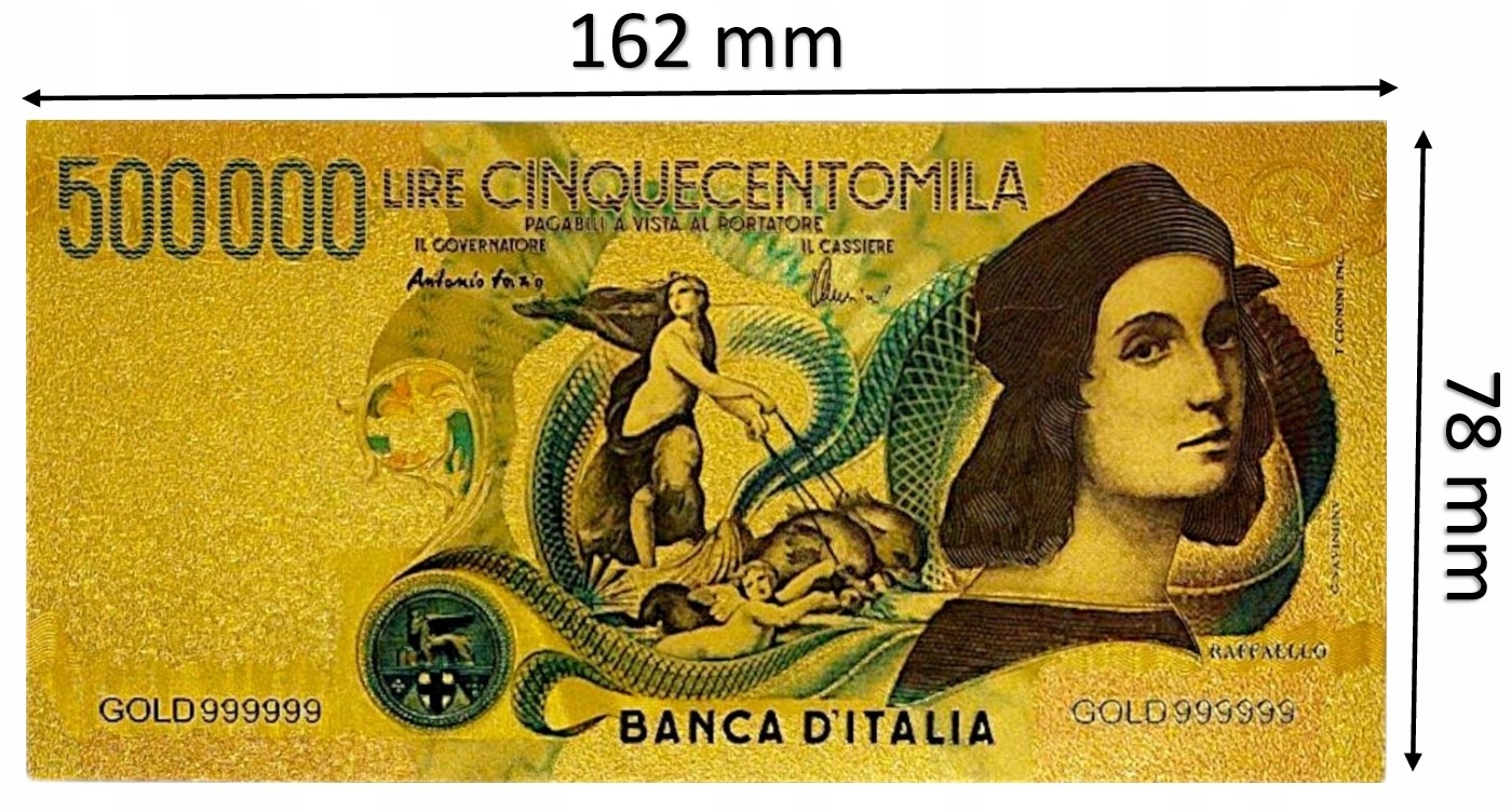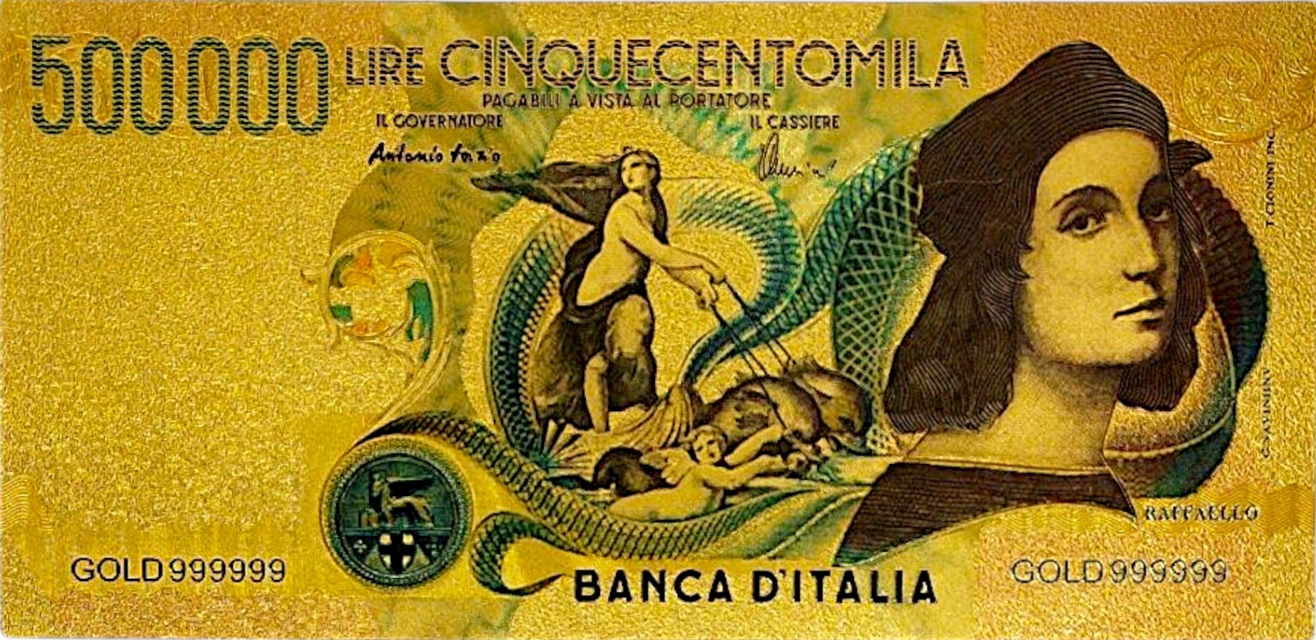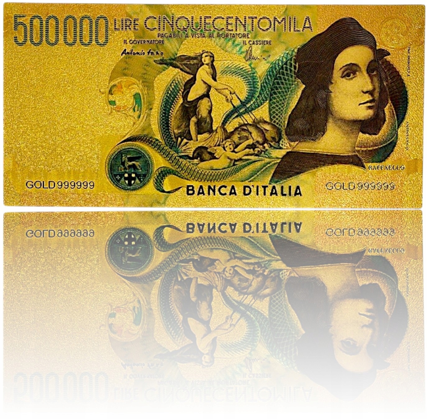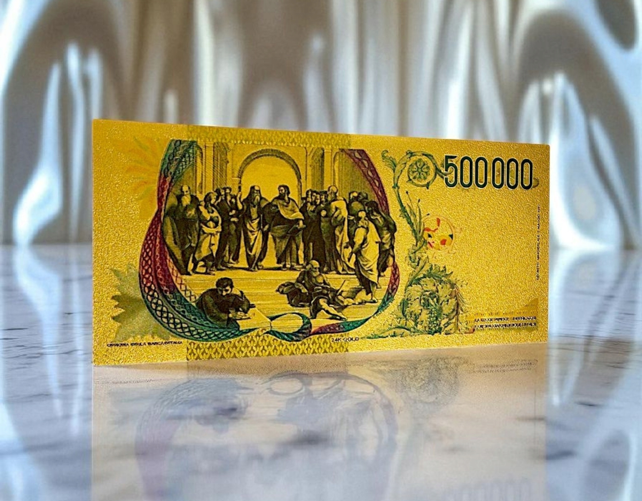 Позолоченная коллекционная банкнота RAFFAELLO номиналом 500 000 лир из ПВХ, подарочная