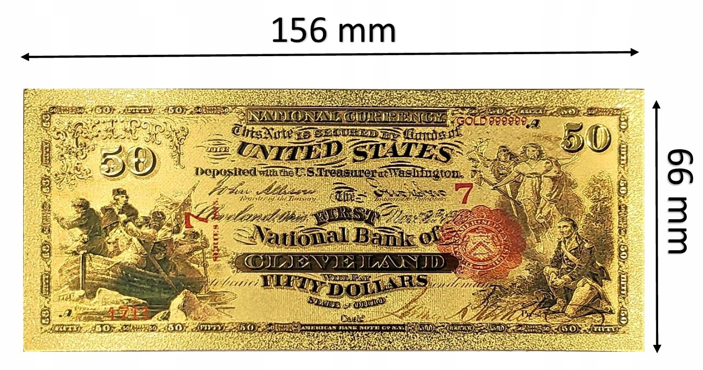 Точная копия американской банкноты первой серии 1875 года, изготовленная из ПВХ и покрыта золотой фольгой.