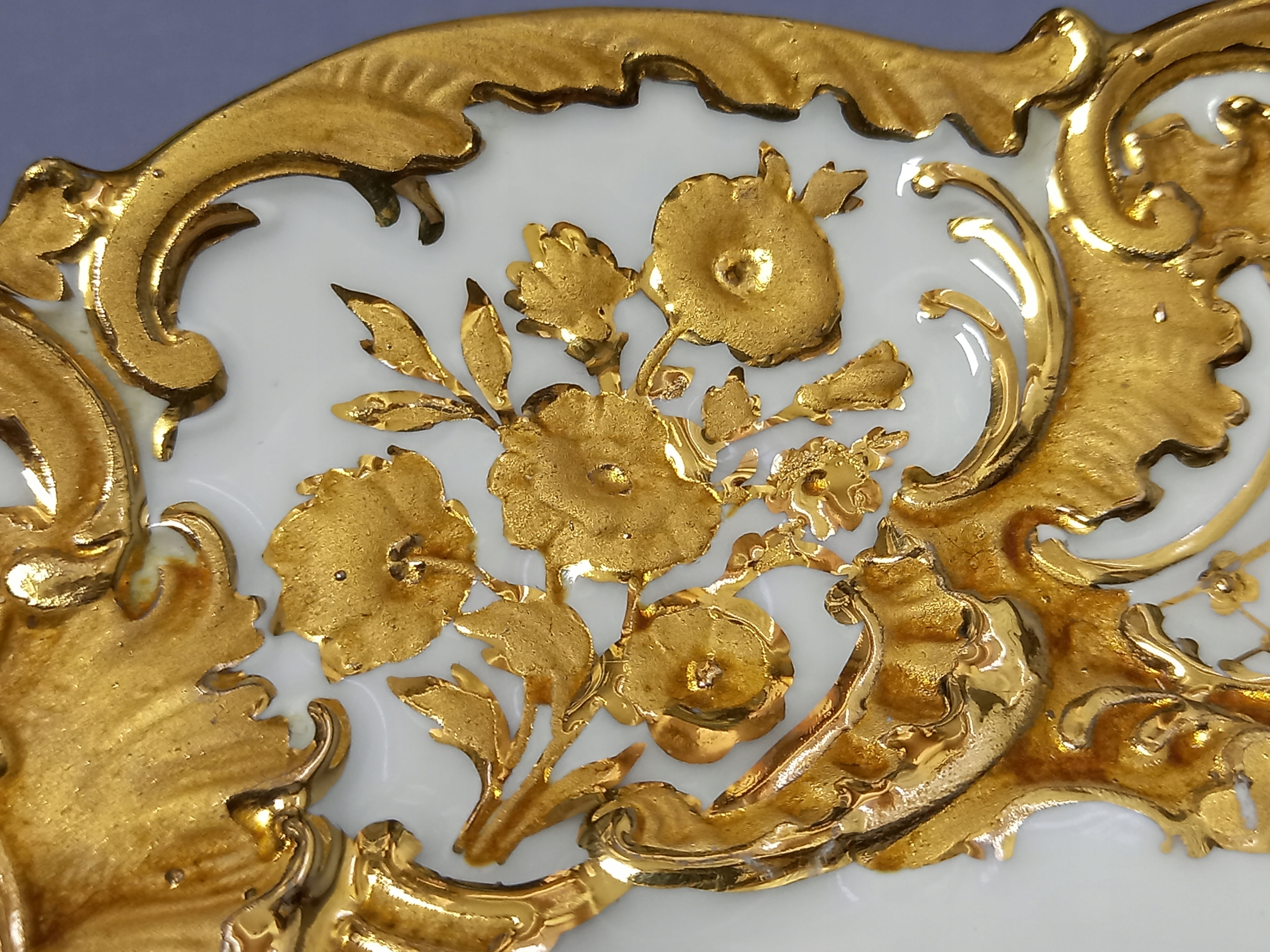 Белоснежный фарфор, изысканной формы: на широком воротнике художественные надглазурные рельефы, богато позолоченные. В зеркале красиво расписанный вручную букет с голубой анемоной (анемоной). Фарфор и украшения высочайшего качества!