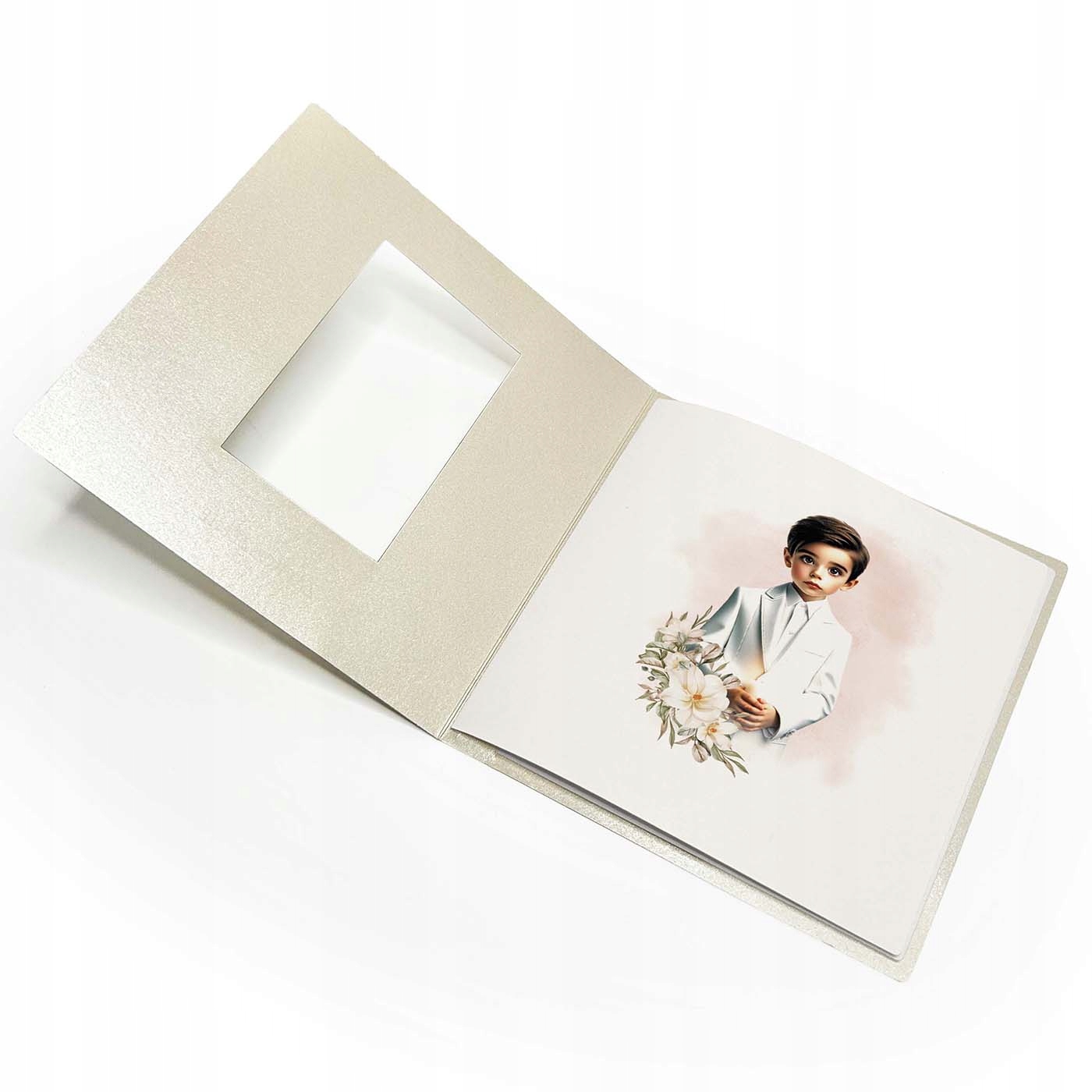 В центральной части приглашения находится тонкая золотая рамка и надпись «Приглашение». Золотая рамка окружает вырезанное лазером отверстие, через которое видно изображение мальчика в одежде для причастия, напечатанное на первой стороне вкладыша.