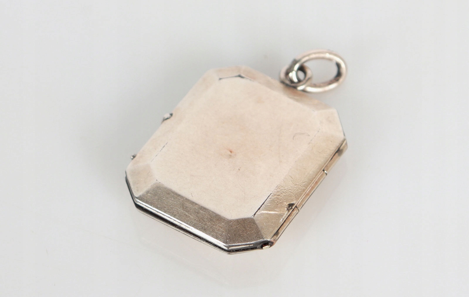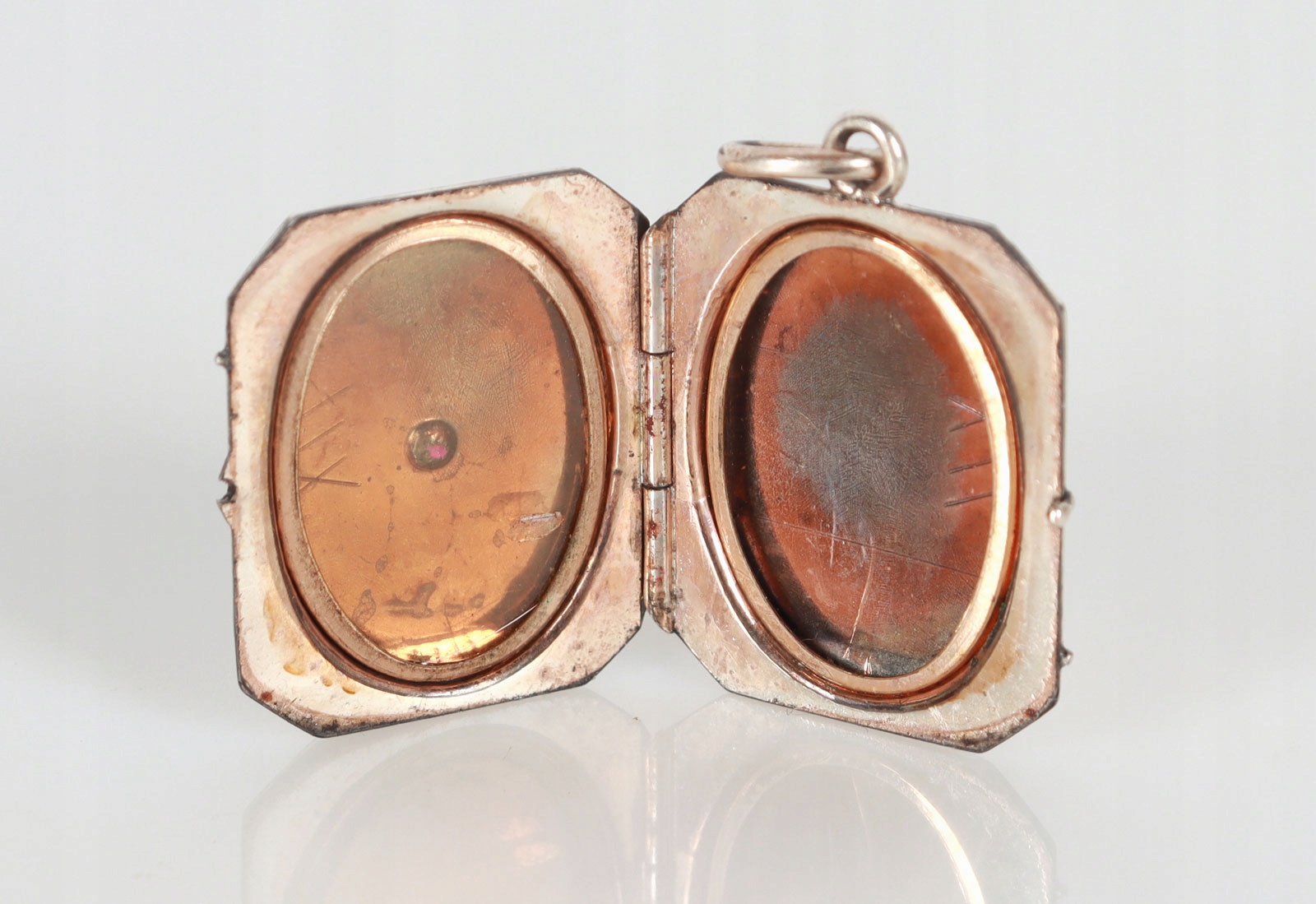 медальон, сделанный из позолоченной латуни. Фронт украшен натуральным пистованным шлифом гранатом. Стороны передней части, украшенные гравированным геометрическим мотивом. Складный медальон, две фото -рамки внутри.
