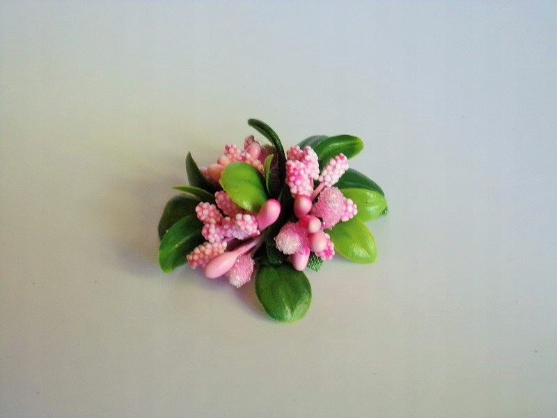 Заколка изготовлена из ярких цветочных аксессуаров и зеленых листьев.