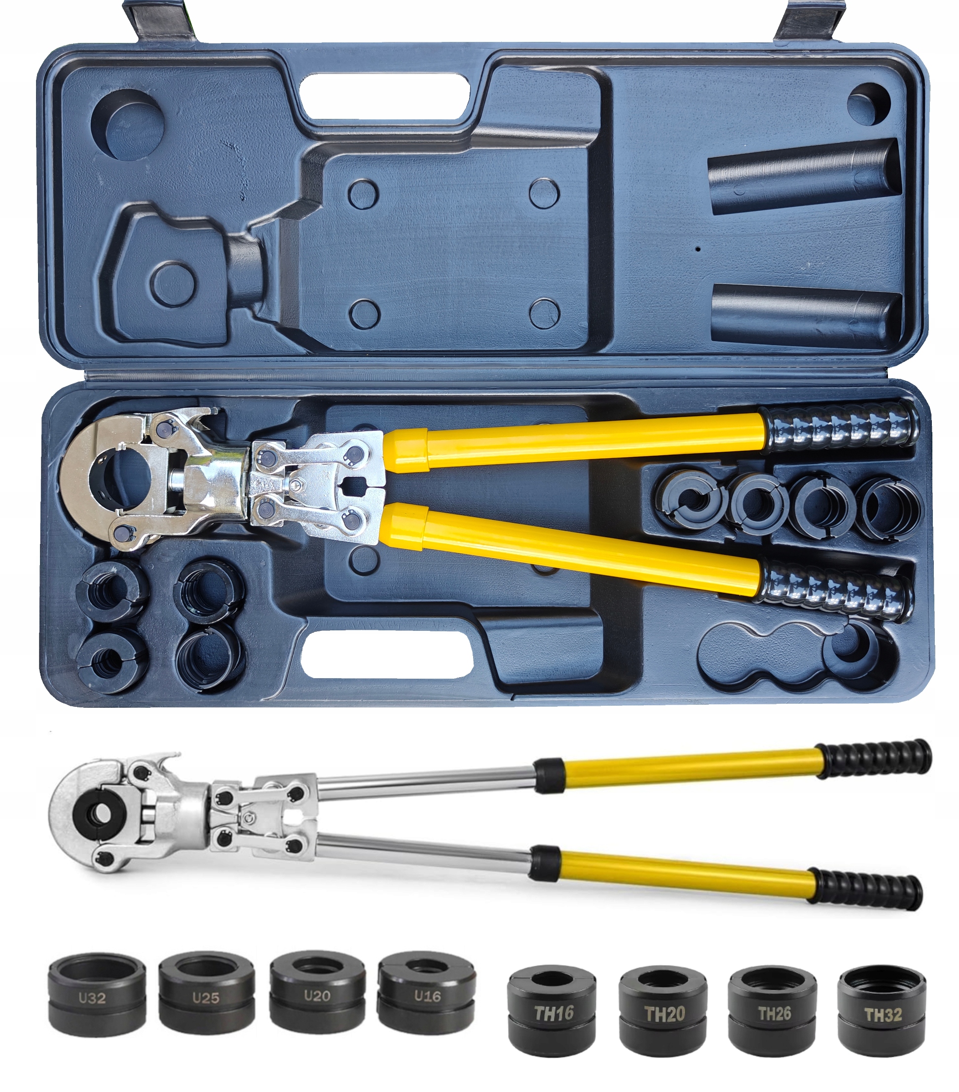 В комплект входят сменные плашки ТН диаметром 16 мм, 20 мм, 26 мм и 32 мм и плашки U размерами 16 мм, 20 мм, 25 мм, 32 мм, которые позволяют работать с наиболее популярными размерами труб PEX. Дополнительным преимуществом обжимного устройства является его совместимость с матрицами профилей U, V, M и TH, что повышает его универсальность и делает его идеальным выбором для различных типов монтажа. Благодаря системе простой замены матрицы инструмент чрезвычайно функционален и адаптирован к потребностям пользователя.