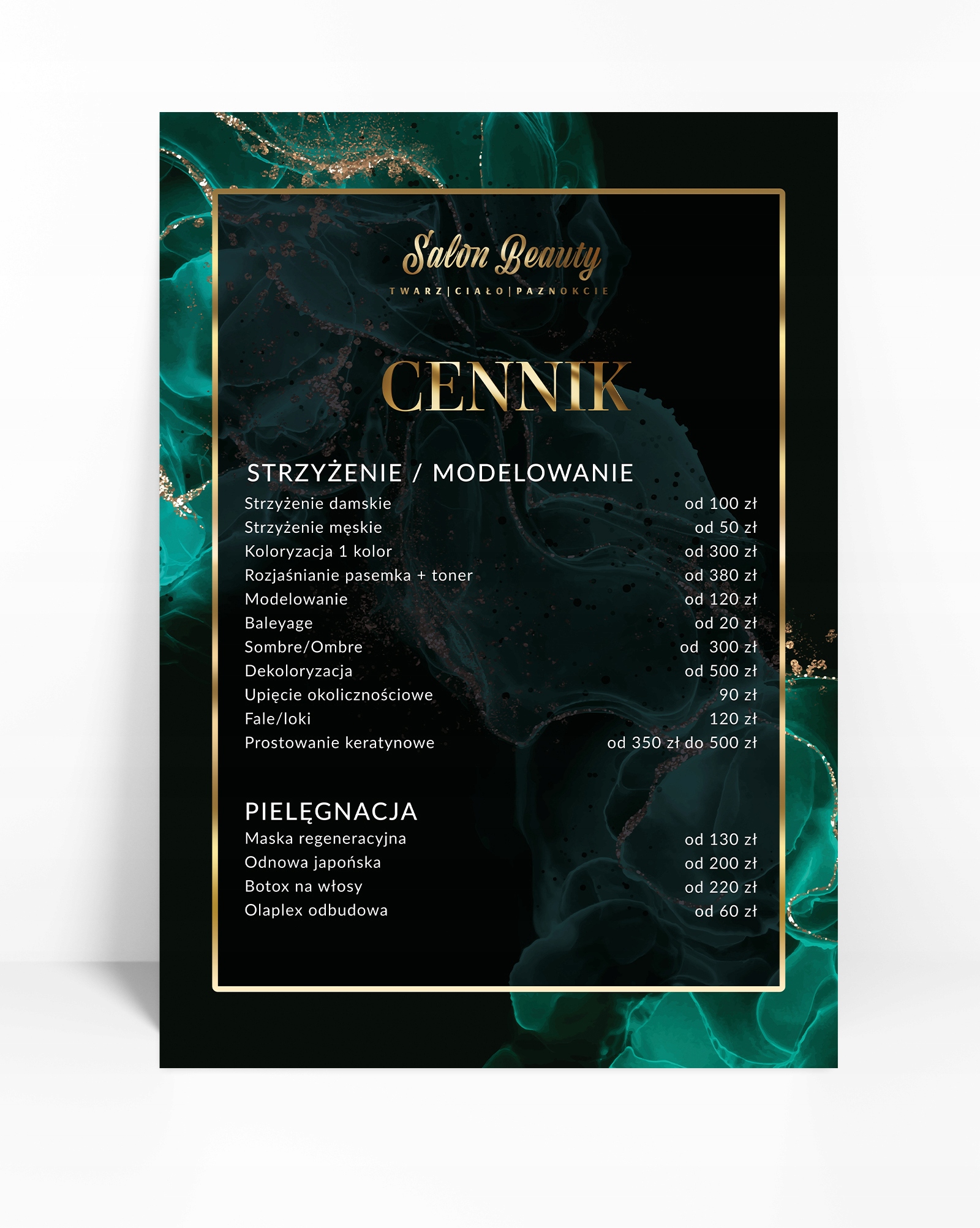 Cennik usług SALON BEAUTY FRYZJER marmur złoto PROJEKT + DRUK A4 C13