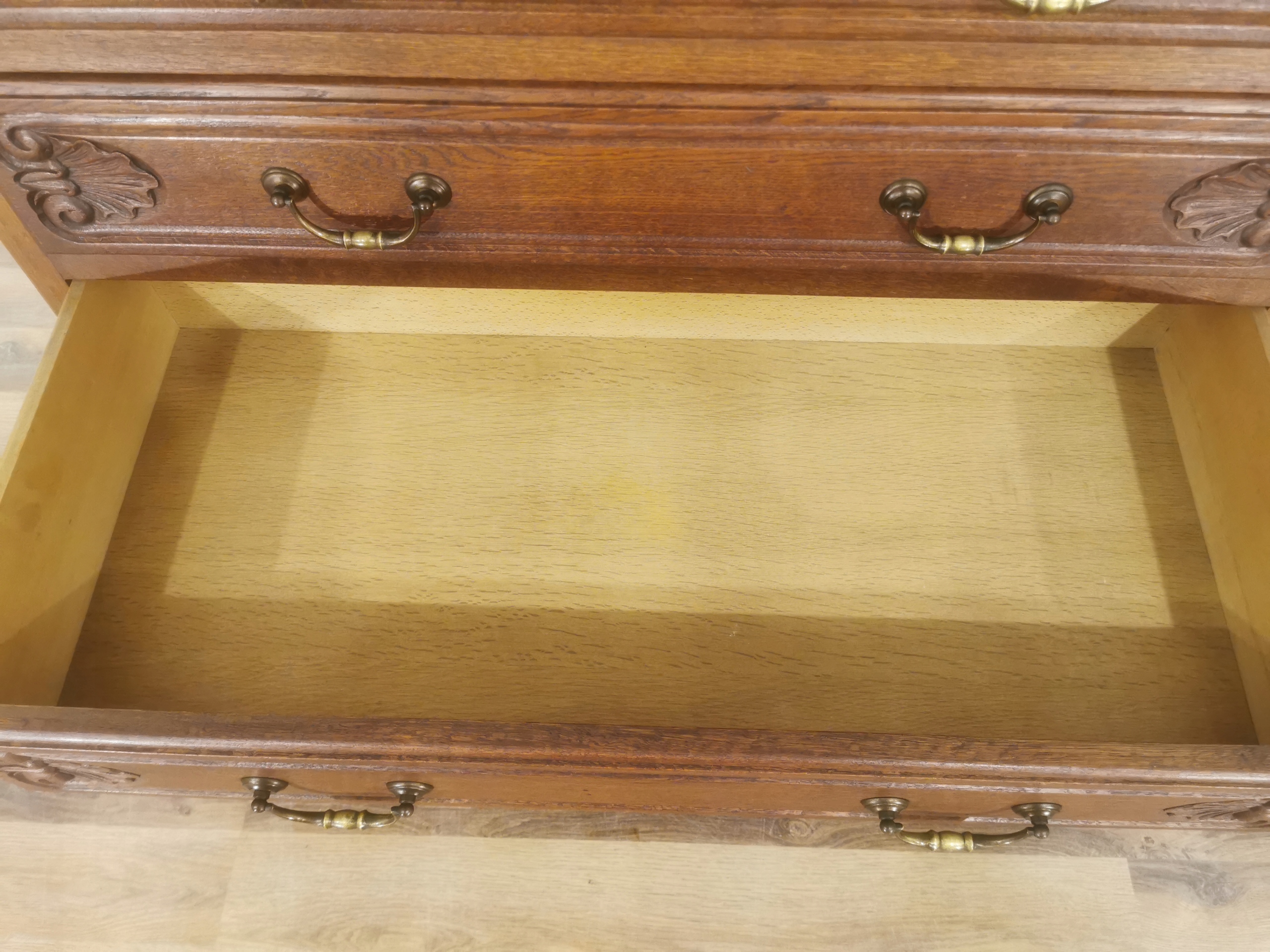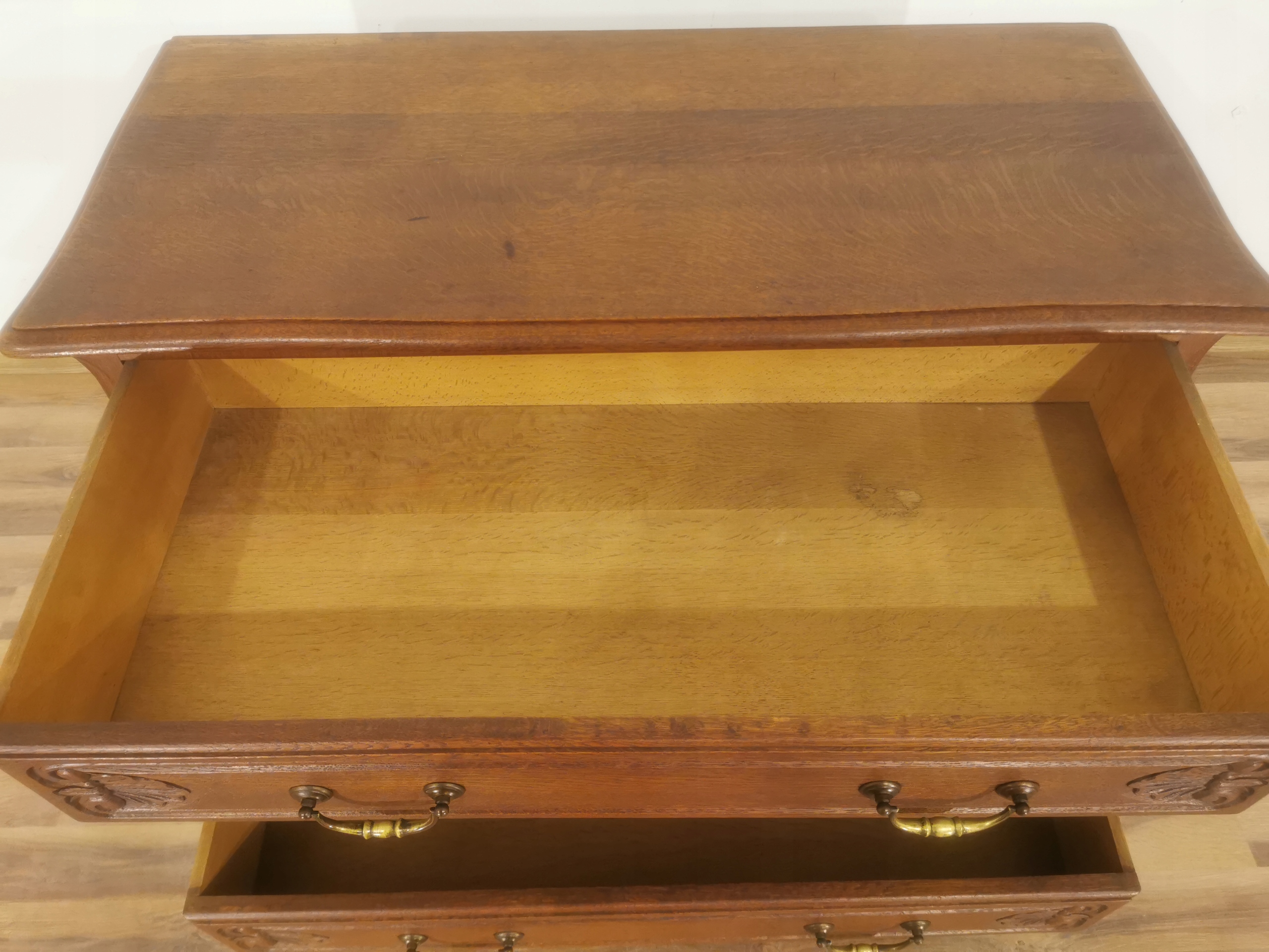 Верх, передняя и рама сундука с ящиками, изготовленным из твердого дуба.
