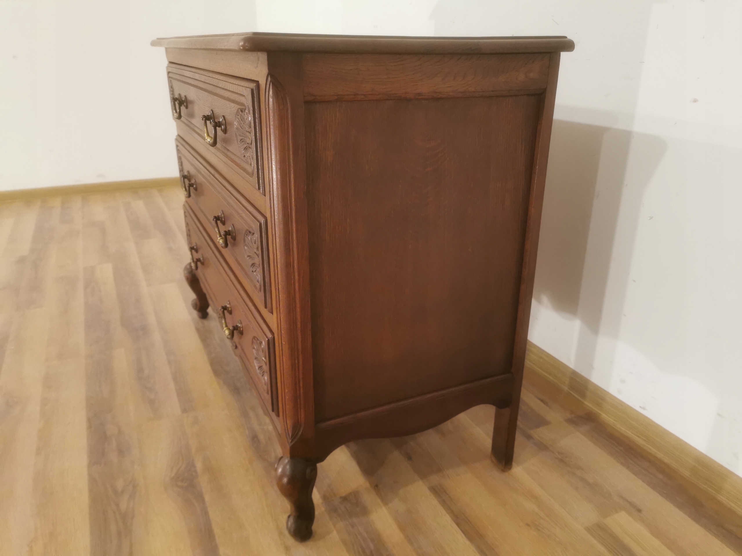 Грудь ящиков имеет прямоугольный верх с округлым краем. Расположен на кабриолетируемых ногах.