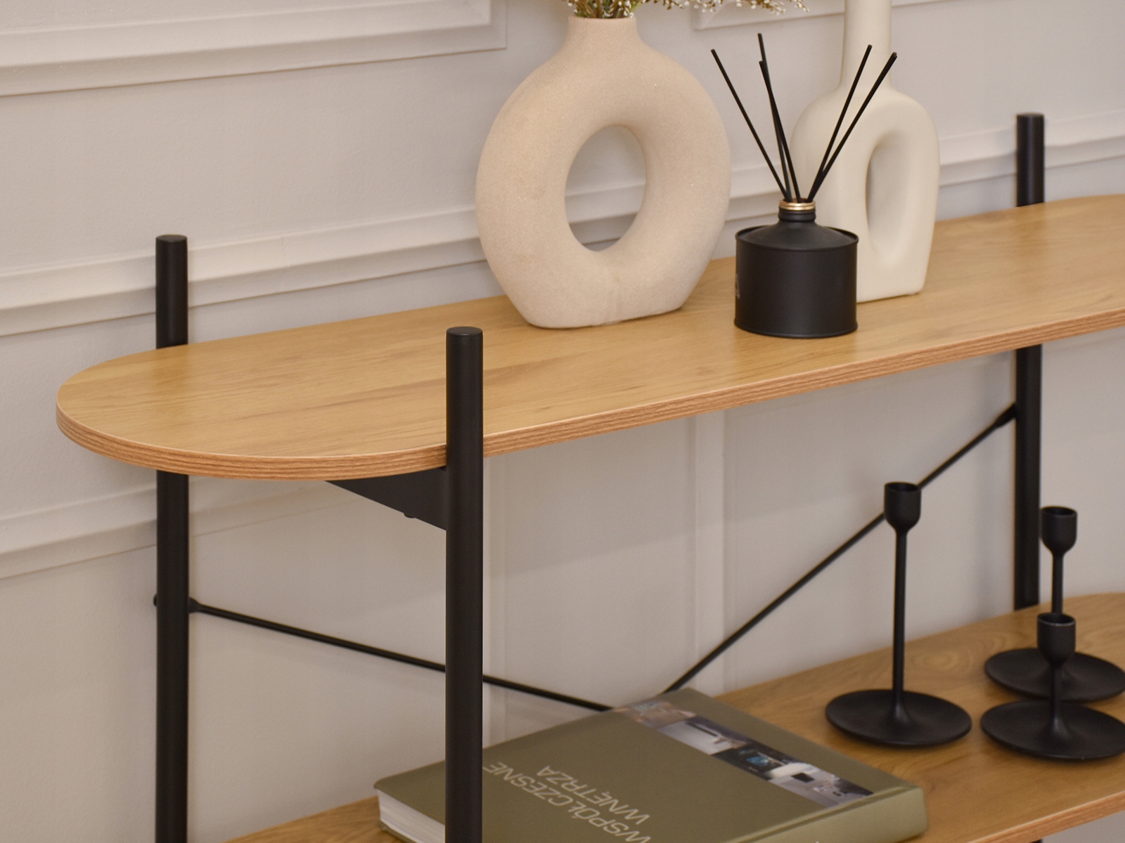 Наша консоль изготовлена из высококачественного ламинированного картона, покрытого дубовым шпоном, что придает ей естественный шарм и утонченную элегантность.