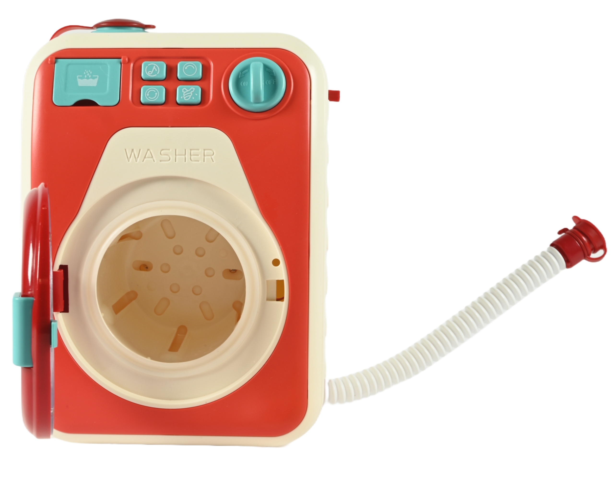 Стиральная машина оснащена кнопкой запуска, которая запускает весь процесс стирки. Ребенок может выбрать один из 4 режимов работы. Вращающийся барабан добавляет реалистичности и делает игру еще интереснее.
