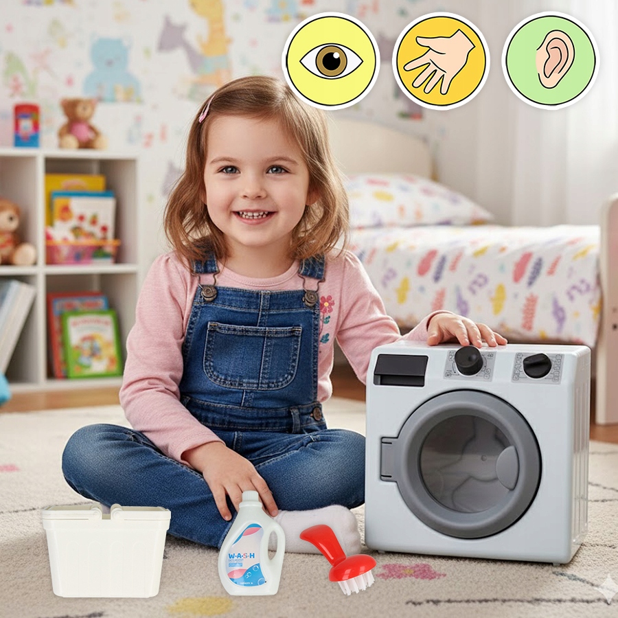 Эта очаровательная детская стиральная машина создана так, чтобы максимально точно имитировать настоящую бытовую технику. Открывающаяся дверца, выдвижной контейнер для моющего средства и кнопки позволяют вашему малышу почувствовать себя так, будто он находится в настоящей прачечной.