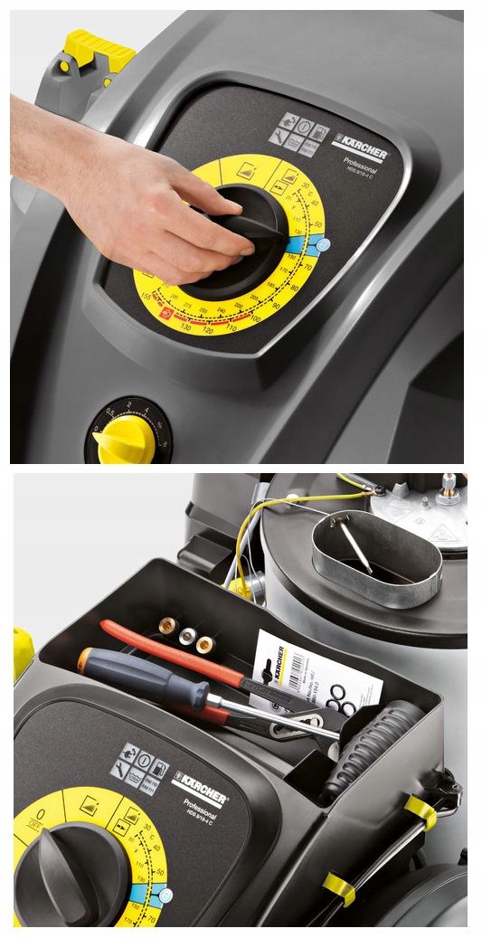 Надежная и мобильная – Устройства компактного класса прекрасно подходят для автомастерских, фермерских хозяйств, ремесленных мастерских и малых предприятий. с собственным автопарком. Установленный на входе фильтр тонкой очистки воды защищает насос от загрязнения. Система гашения вибрации SDS снижает пульсации давления в системе высокого давления. Контроль температуры выхлопных газов отключает двигатель после превышения 300°C, обеспечивая безопасность использования. В стандартную версию входит пистолет высокого давления EASY!Force Advanced. Технология EASY!Force снижает усилие, необходимое для удержания спускового крючка пистолета, до нуля. Дополнительно устройство имеет систему крепления оборудования EASY!Lock, которая позволяет менять оборудование в 5 раз быстрее, чем традиционная резьбовая система. Большая ручка управления предназначена для включения и выключения устройства, выбора холодной и горячей воды и регулировки температуры воды. С помощью ручки можно установить режим eco!efficiency. Затем вода нагревается до 60°C, а расход топлива снижается до 20%.