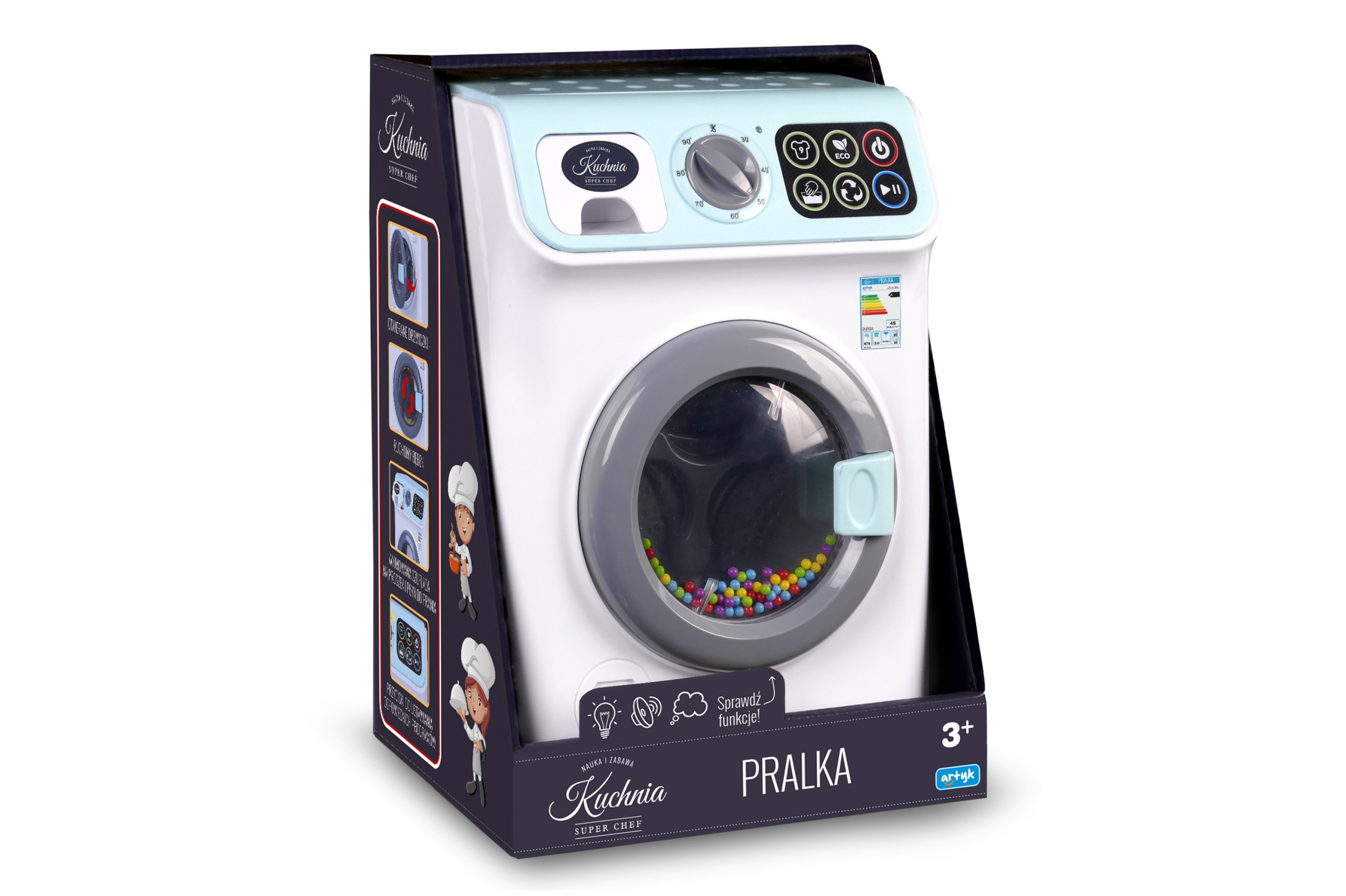 Дополнительным преимуществом игрушки является открывающийся барабан стиральной машины и выдвижной ящик для порошка.